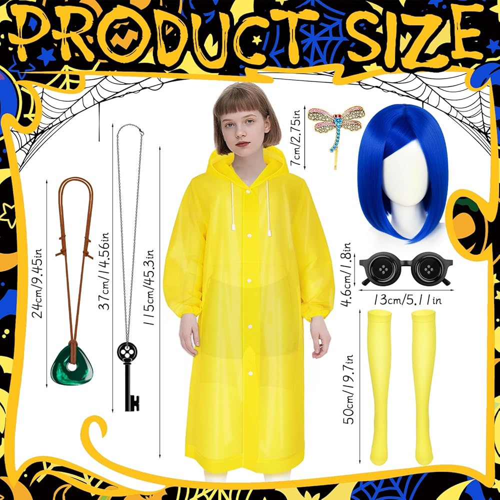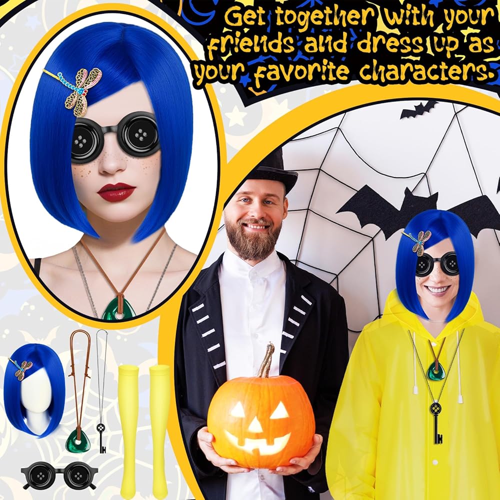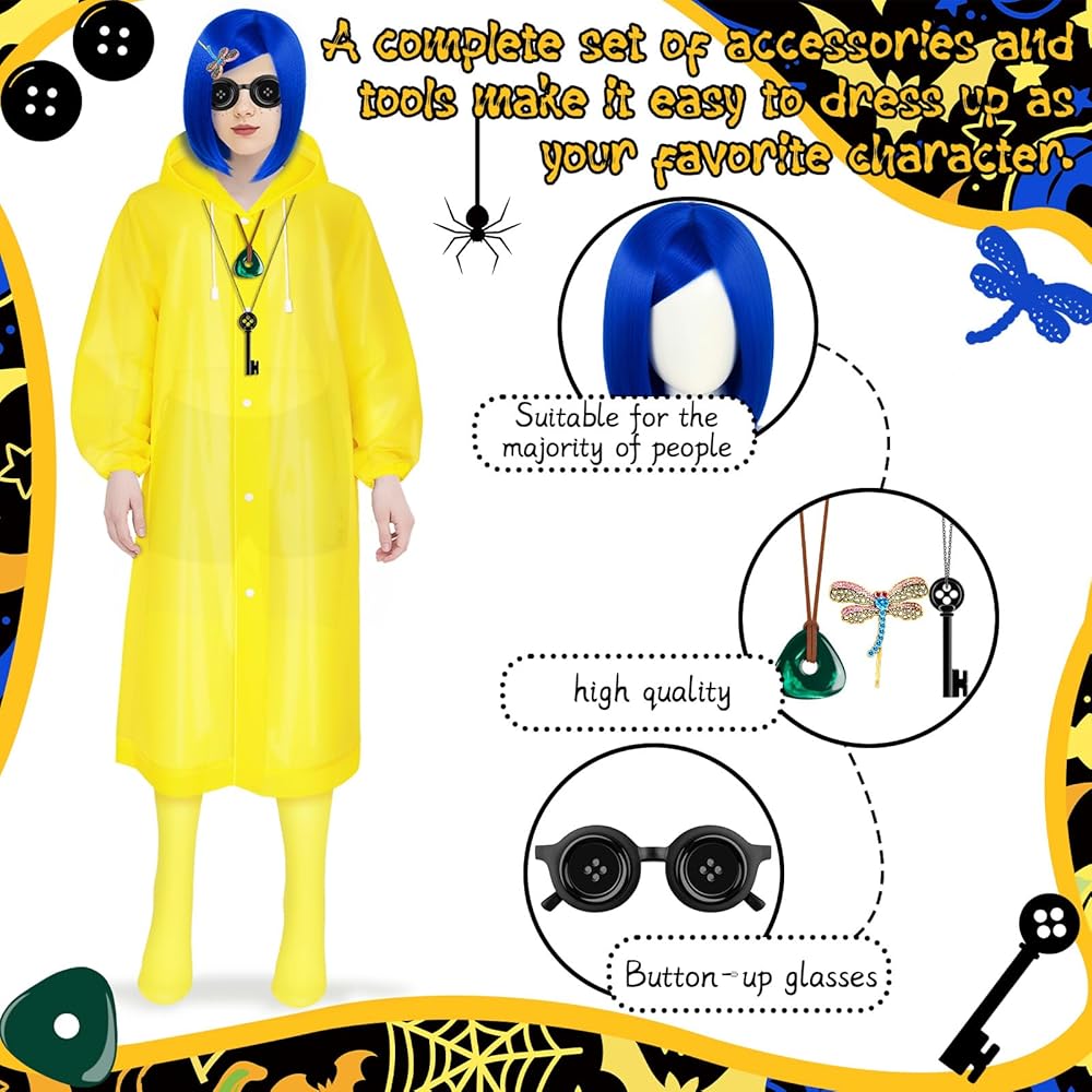 Product Include:You will receive a blue wig, a set of hairpins, a necklace, glasses decorations, a yellow raincoat, a pair of yellow socks and a freckle pen. There are enough quantities to help you dress up well and meet your different aesthetic needs.