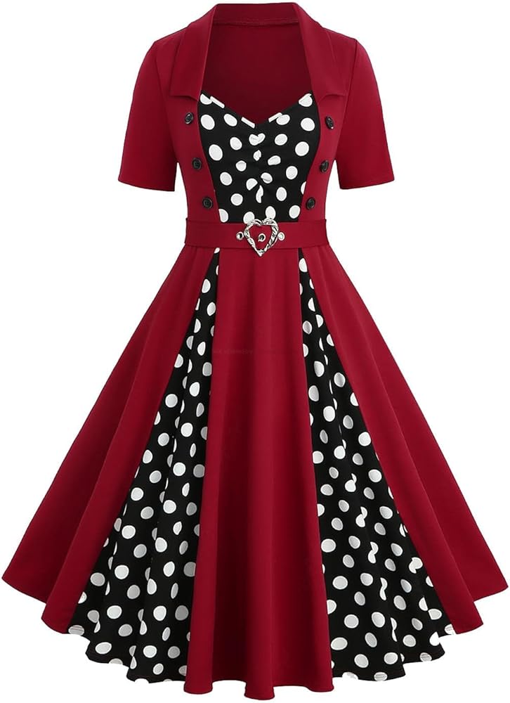المميزات--فستان متوسط الطول كلاسيكي من الخمسينيات، فستان مطوي للأسفل، فستان بأكمام قصيرة، فستان عتيق على شكل حرف A، فستان متأرجح، رقبة على شكل حرف V، فستان للحفلات، فستان كاجوال، أزرار، إبزيم على شكل قلب، قماش عالي التمدد.