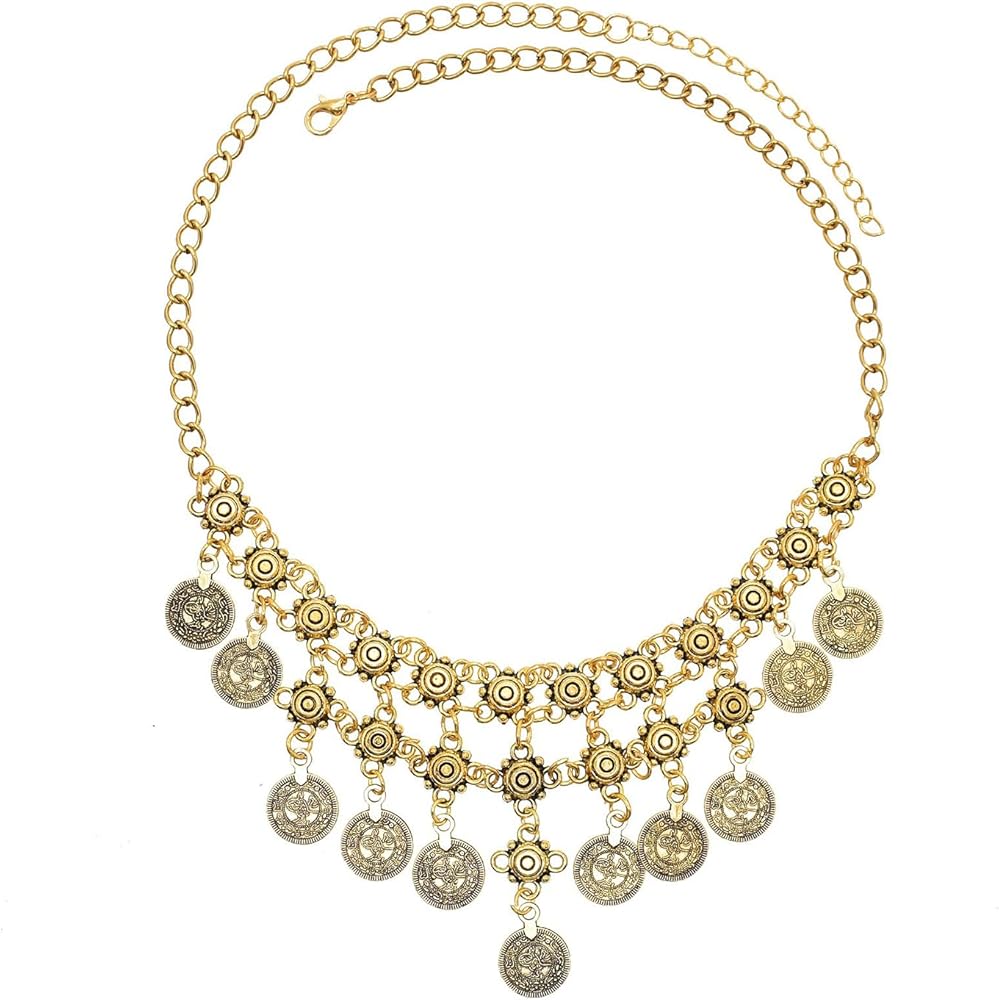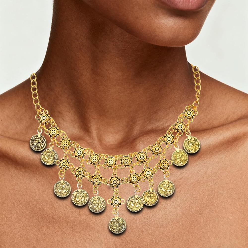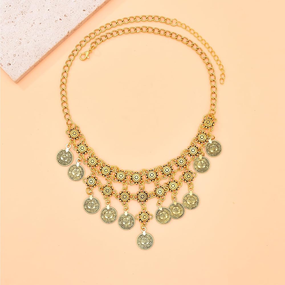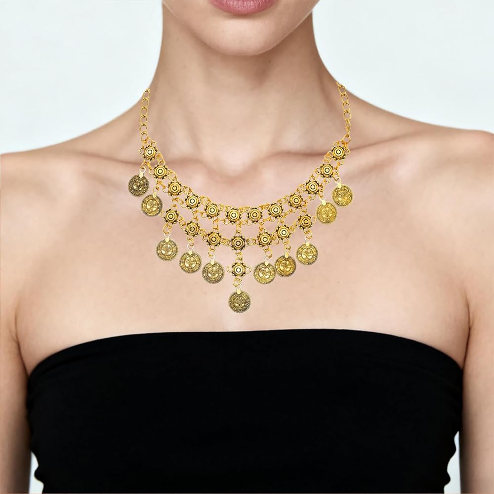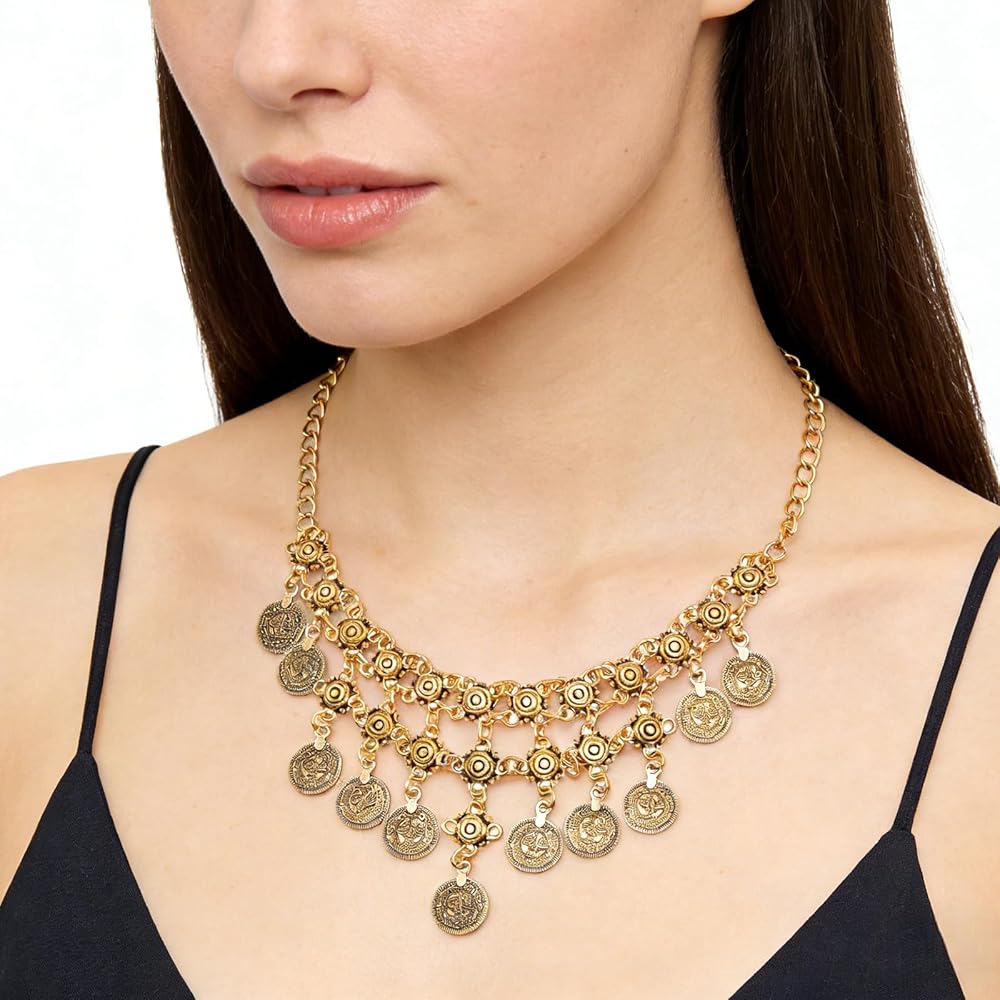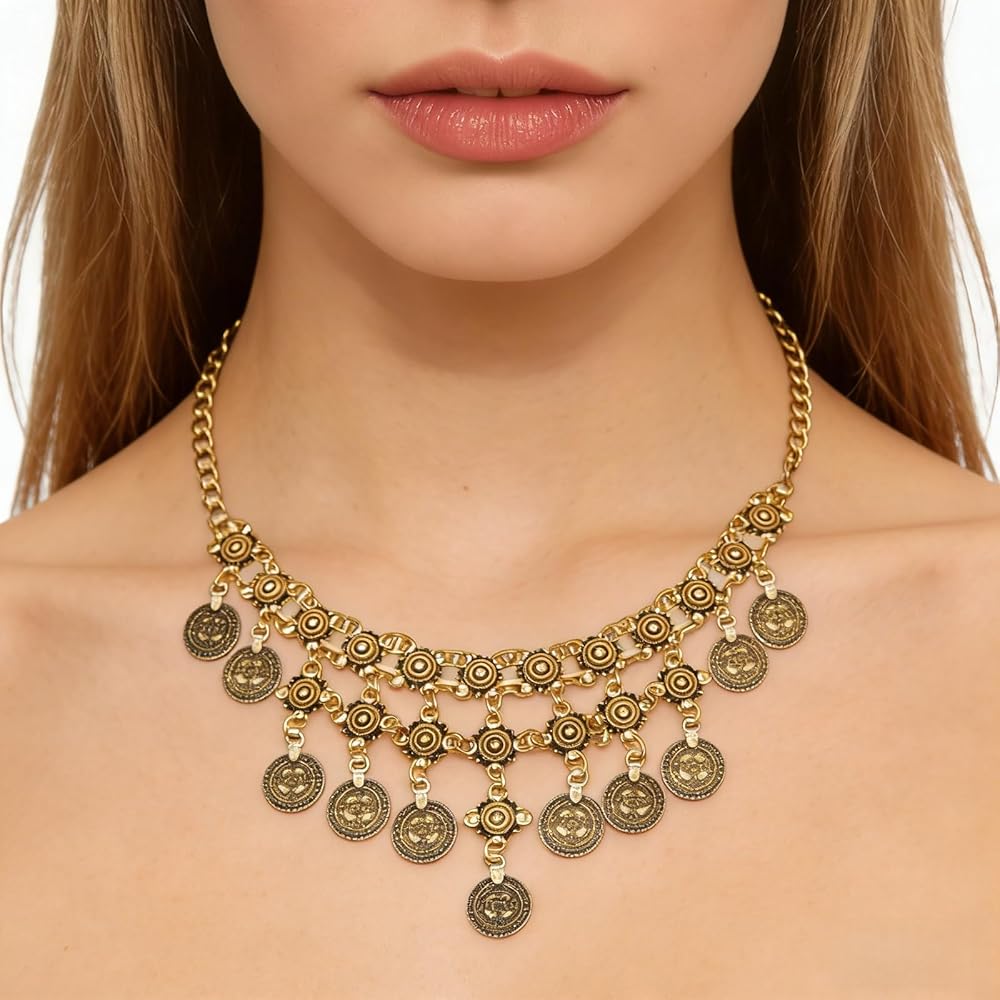 Ethnic-Inspired Coin Pendants: Dangling gold-tone coin charms create eye-catching movement and bring a touch of vintage tribal flair to your neckline.