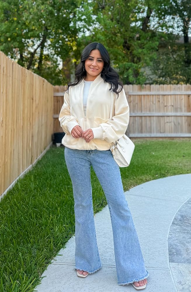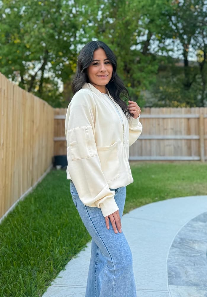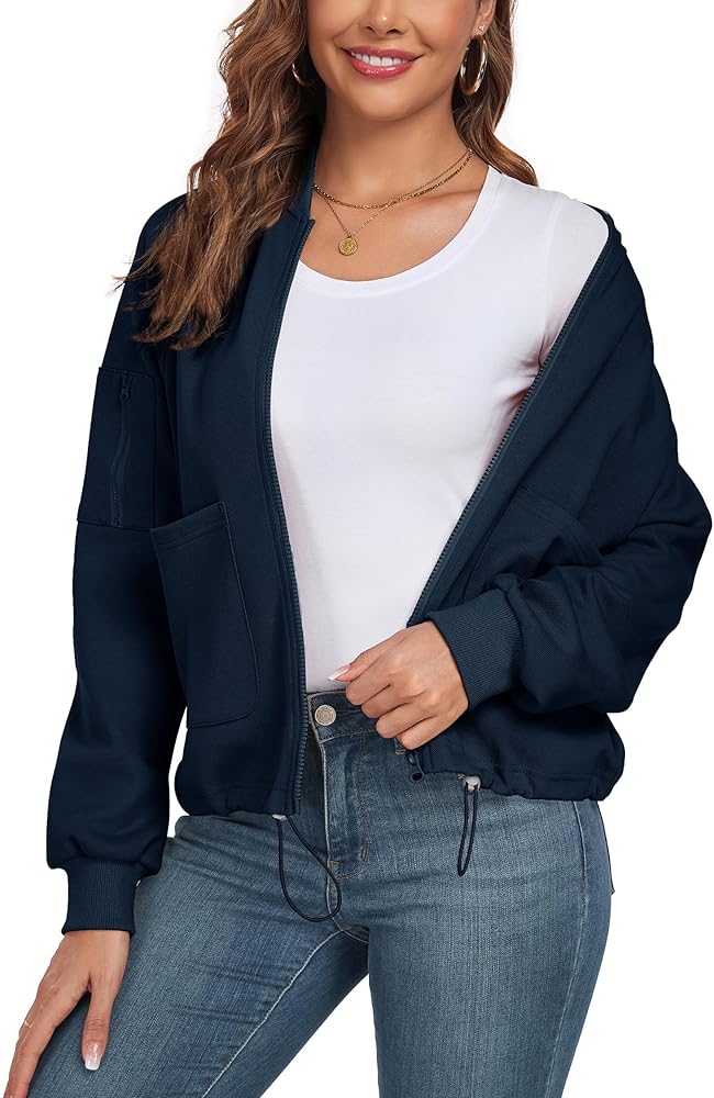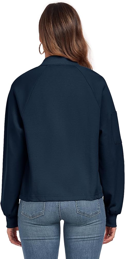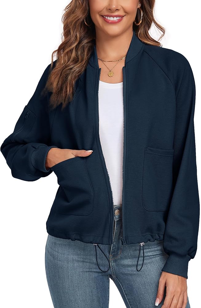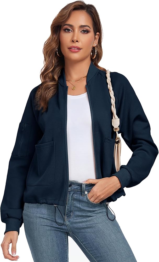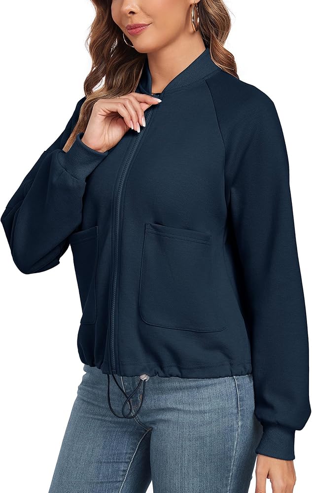 المزايا: تصميم سترة بومبر للسيدات بياقة واقفة وسحاب كامل، توفر هذه السترة العصرية ذات الأكمام الطويلة مظهرًا كاجوال وعصري يمكن ارتداؤه بسهولة لأعلى أو لأسفل في أي مناسبة