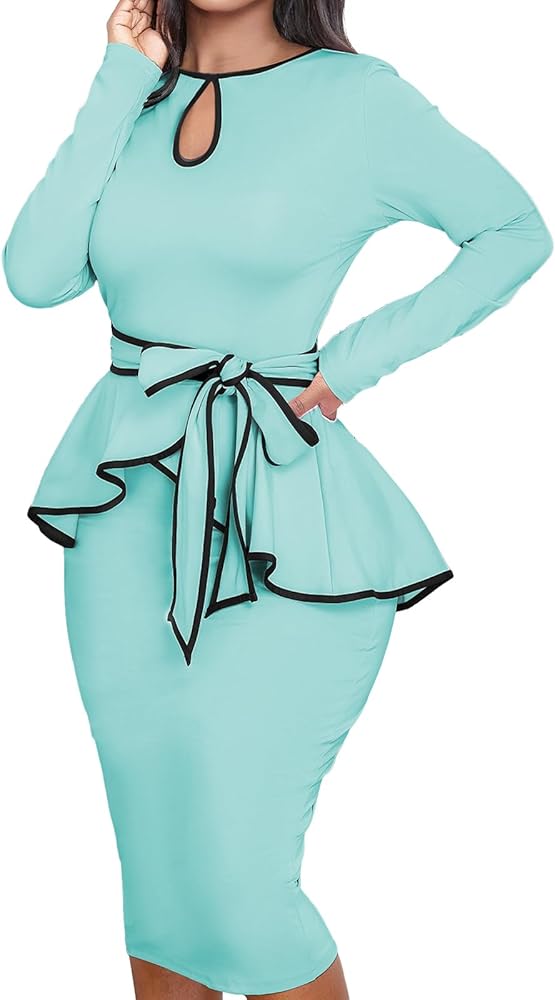 • فستان بيبلوم ذو قلم رصاص للنساء يتميز برقبة دائرية وأكمام طويلة وفستان بيبلوم ضيق.