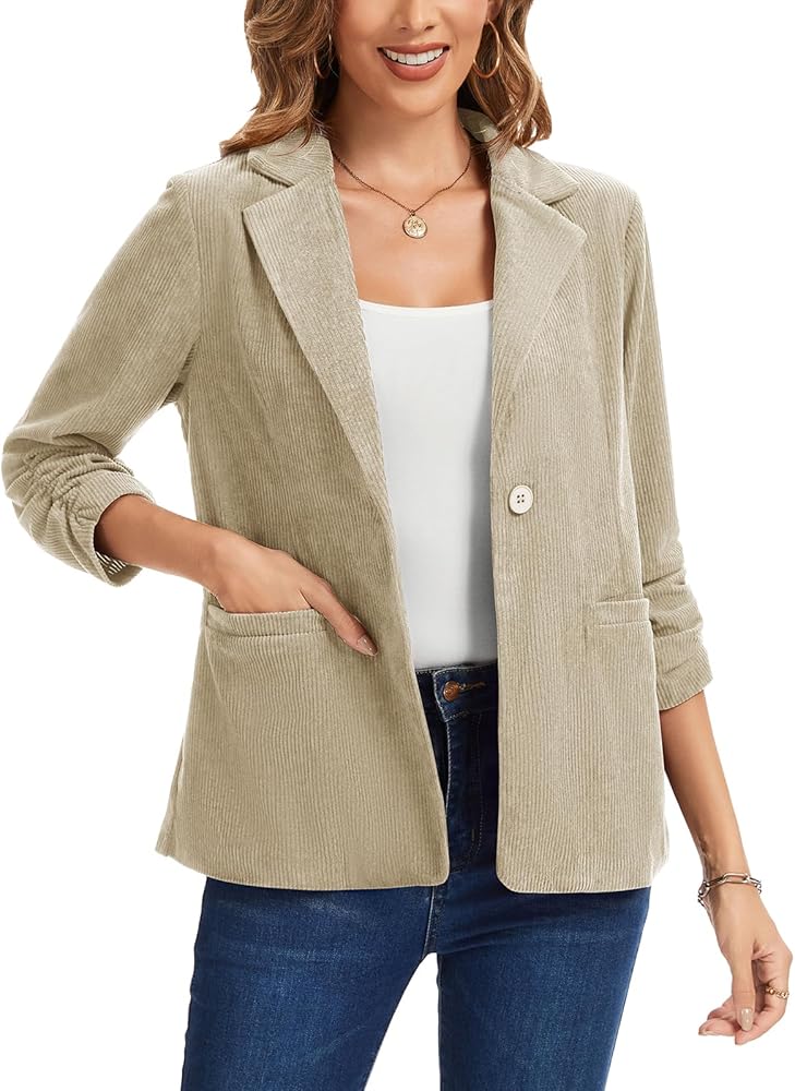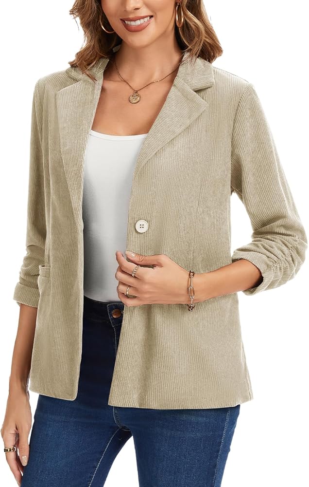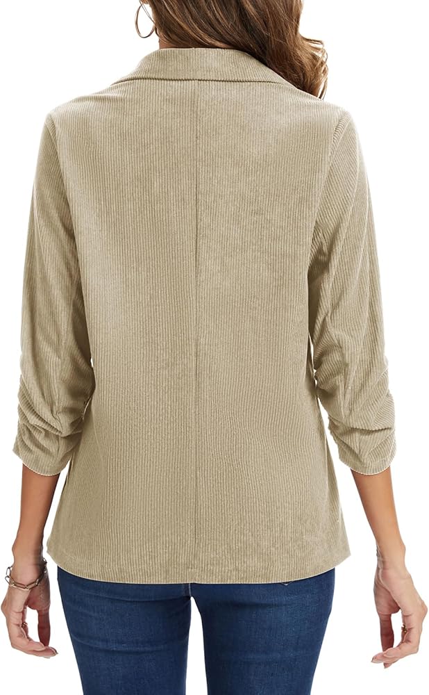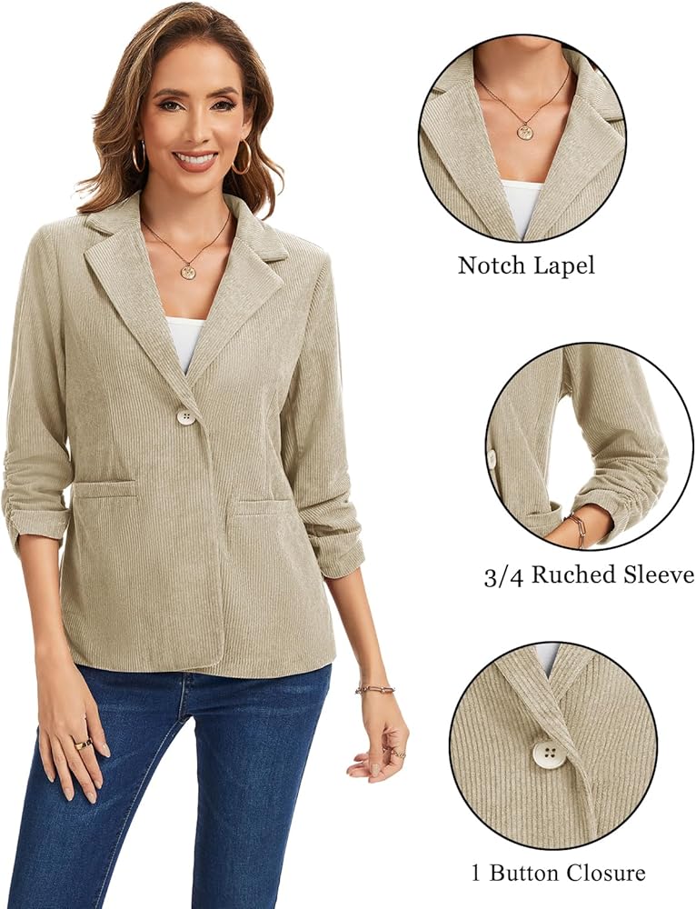 【ميزة الموضة】: سترة قصيرة مكشكشة بأكمام 3/4 مفتوحة من الأمام مع جيوب عملية، زر للإغلاق، سترة بياقة مشقوقة للسيدات الكاجوال. سواء كنت ترتدي زوجًا من الجينز أو تضيف طبقة من الرقي إلى مظهرك الجاهز للعمل، فإن الصورة الظلية الأنيقة والنسيج المريح المطاطي لهذا الجاكيت القصير ذو طية الصدر يجعله الخيار الأمثل للأناقة والراحة الاحترافية.