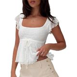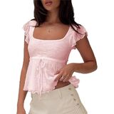 Features: Embrace fairycore aesthetics with a front lace up square neckline, flutter cap sleeves, and ruffled peplum hem. Slim fit silhouette with layered floral lace mesh, solid color, ruched, flowy a line babydoll tee top, tiered, trendy fashion spring fall streetwear