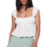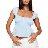 This top combines delicate lace details, a flattering square or v neckline, and soft cap sleeves with ruffle accents to create a look that's both elegant and youthful