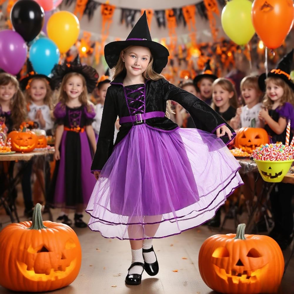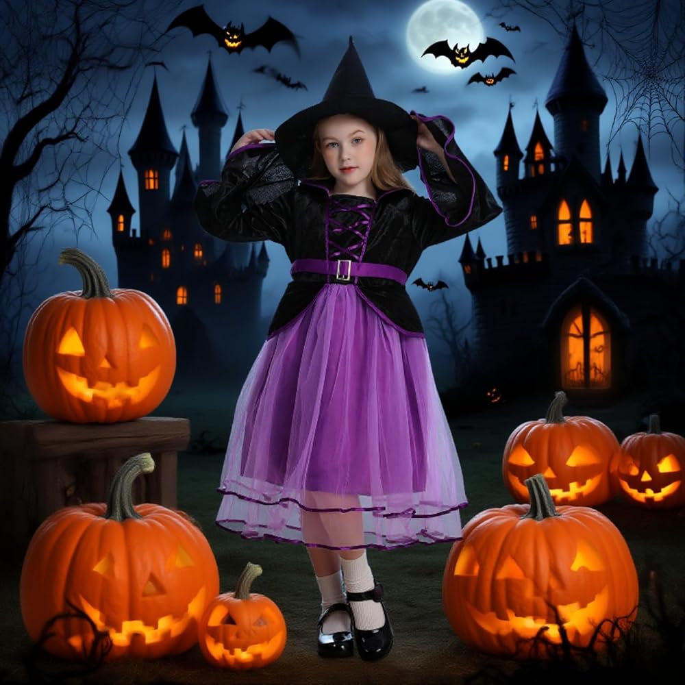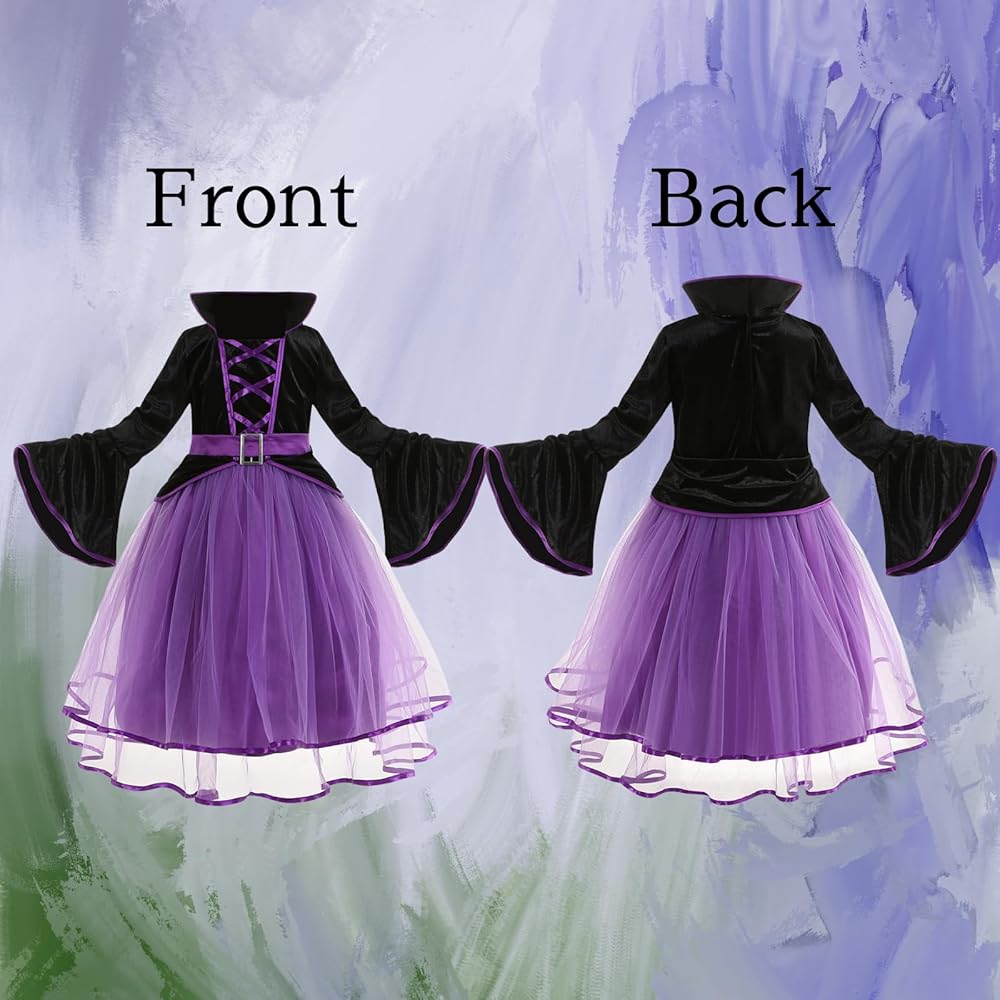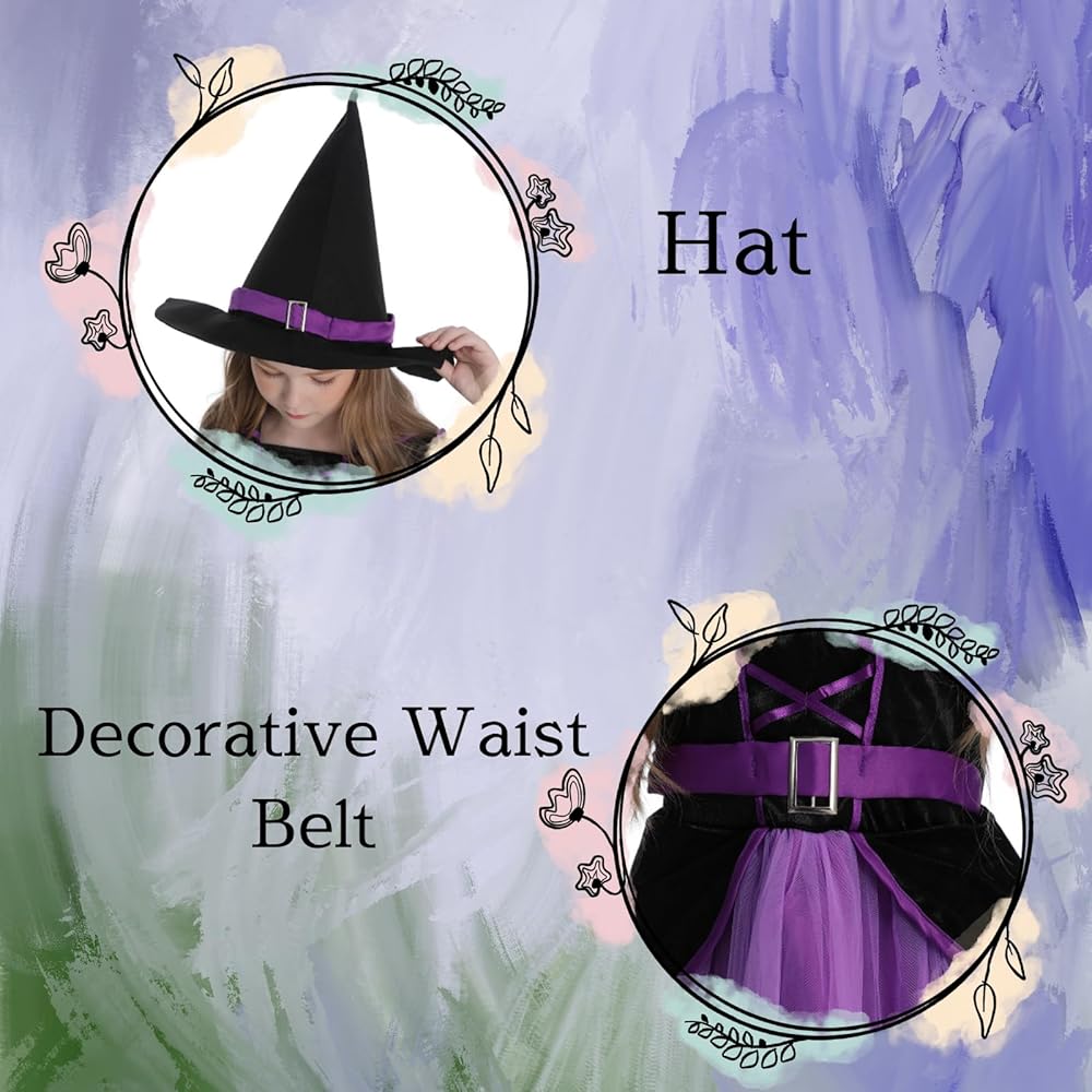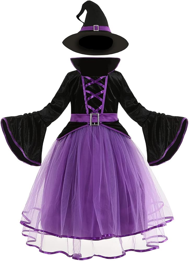 زي الساحرة الأرجواني للفتيات من LMYOVE، زي ساحرة للفتيات مع قبعة، فستان ساحرة الهالوين