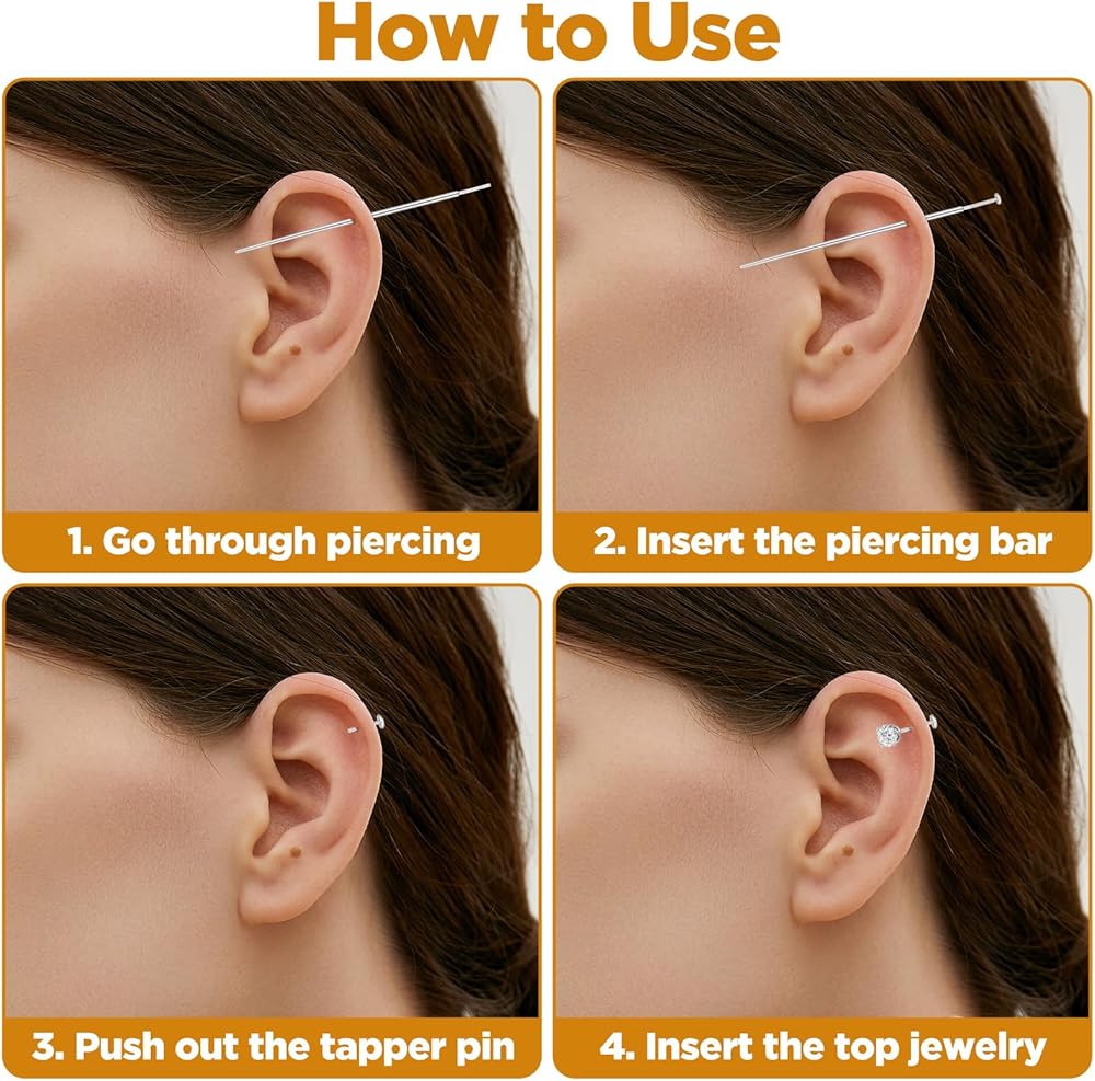 Simple and Safe Operation: This flat back earring tool simplifies the process of applying and changing flat back jewelry. First, insert half of the earring removal tool into the piercing hole. Then, slide the tool bar of the piercing threader into the taper's pin and gently push it through the hole. Remove the taper, leaving the jewelry bar in place, and attach the top or bottom piece of the piercing jewelry.