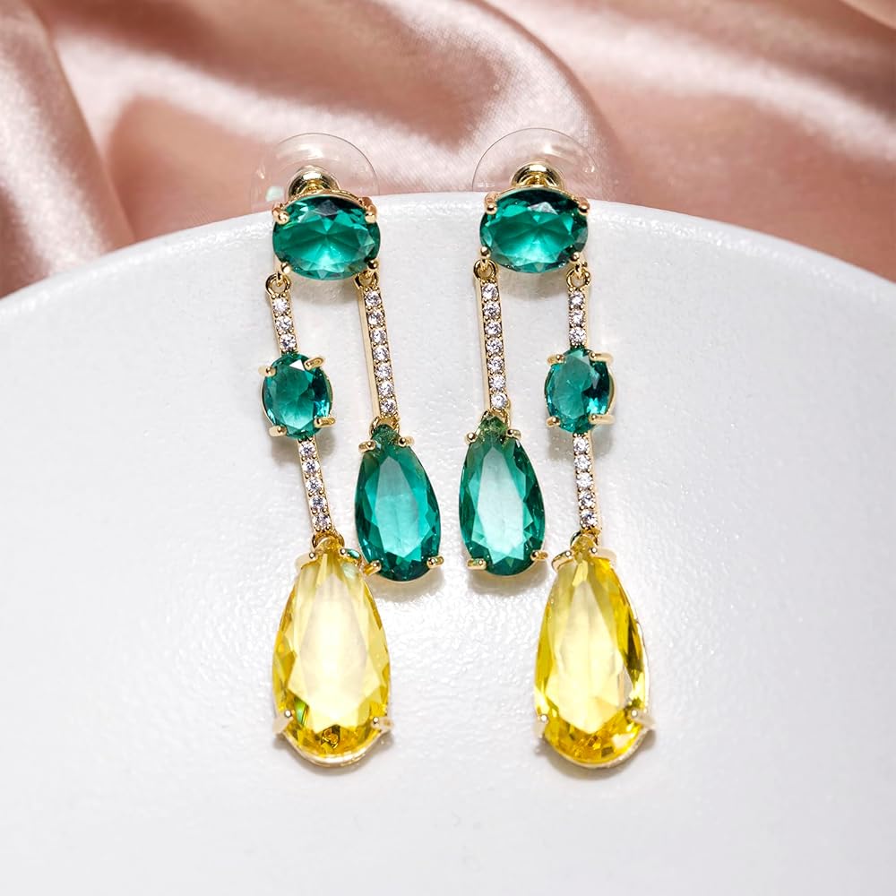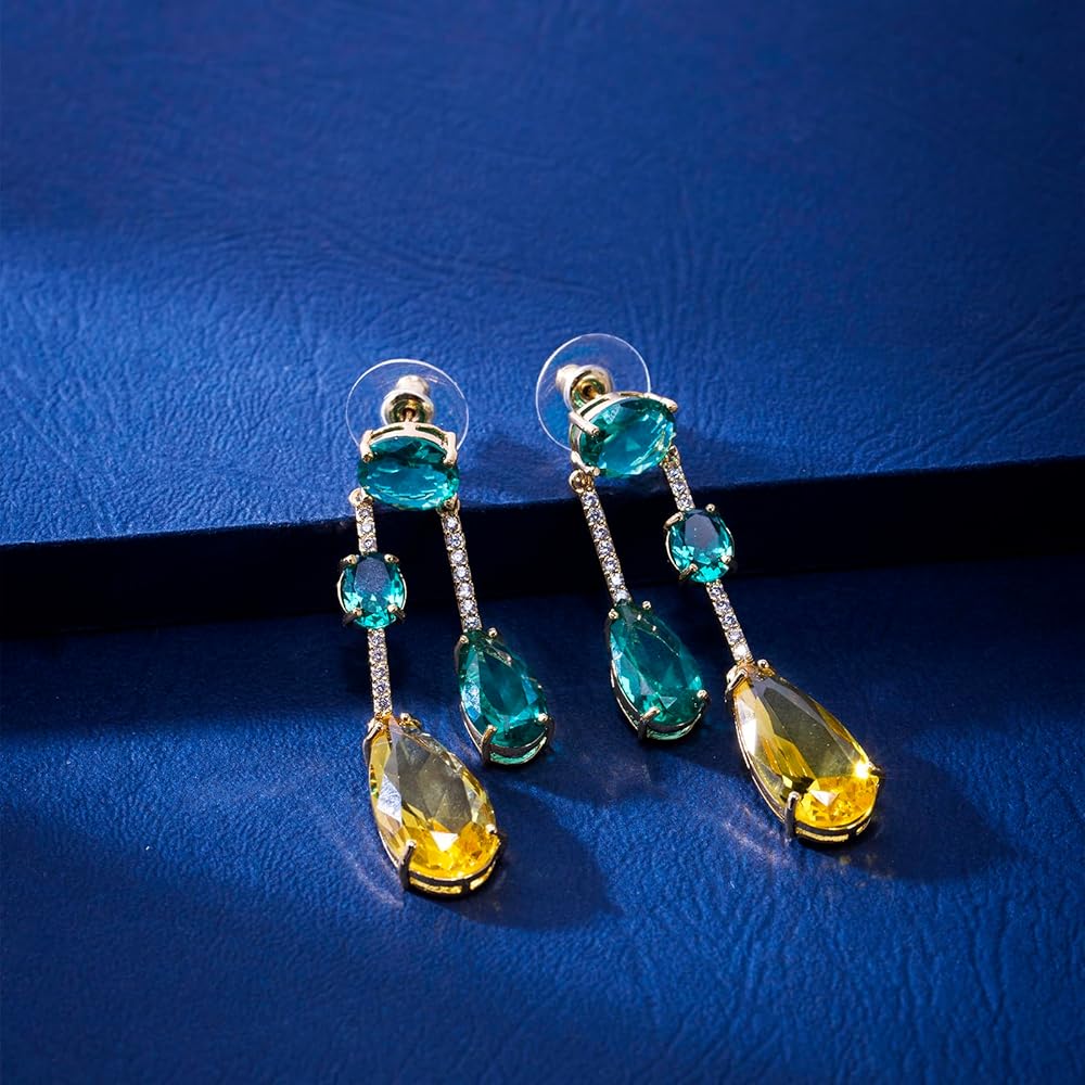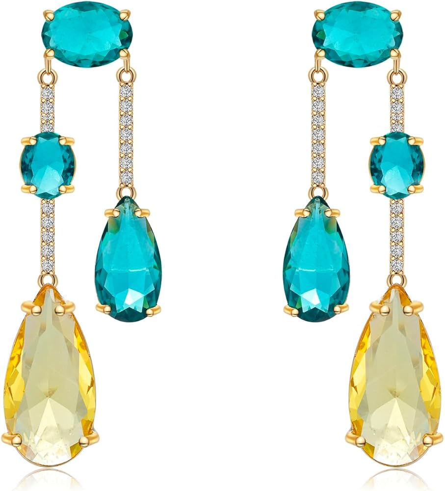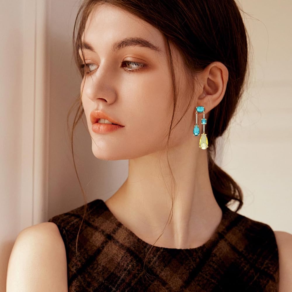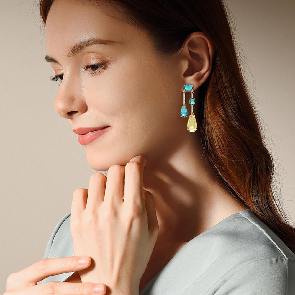 إلهام التصميم: تتميز هذه الأقراط المتدلية من الكريستال على شكل دمعة للنساء بتصميم لا يتأثر بمرور الزمن مع دلايات كريستالية تجريدية دائرية ودمعة وبيضاوية لافتة للنظر بألوان متعددة (الأزرق والأخضر والأصفر) من أجل لمسة فنية عصرية. تم تصميم جوانب الكريستال المقطوعة بدقة لالتقاط الضوء وتعكسه من جميع الزوايا، مما يخلق بريقًا رائعًا وملفتًا للأنظار يضيف بريقًا إلى أي مظهر. يتم اختيار كل كريستالة بعناية لضمان الوضوح وحيوية اللون، مما يجعل هذه الأقراط قطعة مميزة حقيقية.