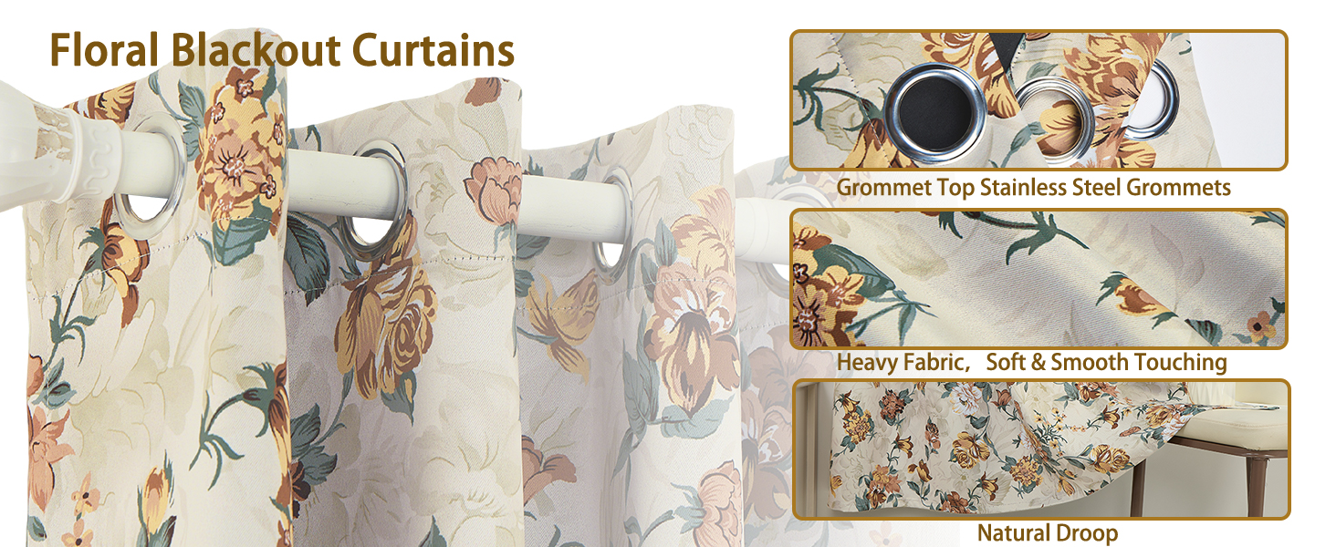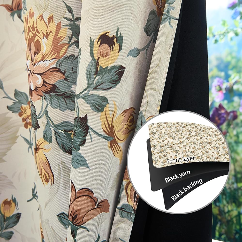 مواد صديقة للبيئة وآمنة: مصنوعة من البوليستر بنسبة 100%، تتميز كل ستارة بتصميم ثلاثي الطبقات: واجهة أمامية مطبوعة بالورود، وطبقة وسطية معتمة عالية الكثافة، وظهر أسود صلب. خالية من الفورمالديهايد أو الطلاءات الكيميائية القاسية أو الروائح الكريهة، توفر هذه الستائر حجبًا آمنًا وطبيعيًا للضوء باستخدام تقنية التعتيم الفيزيائية.