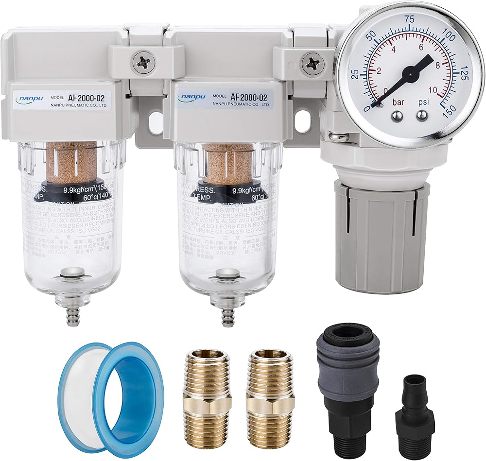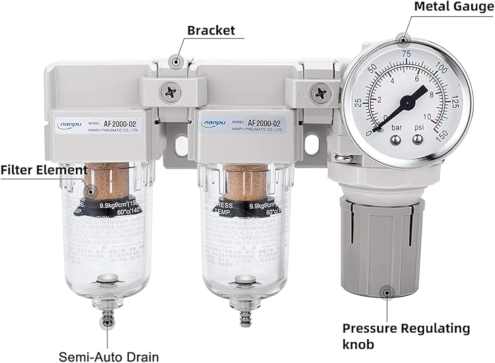 مقياس الضغط (0-150 رطل لكل بوصة مربعة)، وعاء من البولي كربونات، دعامة، تركيبات نحاسية من NPT مقاس 1/4 بوصة، 1 × شريط إغلاق خيط.