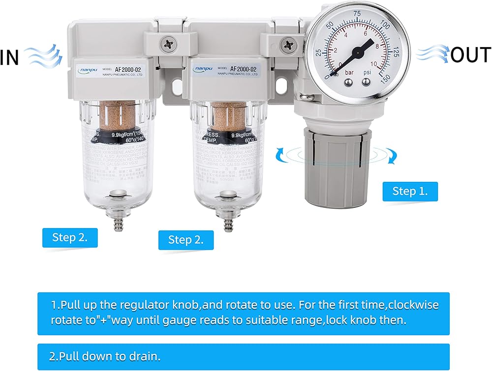 3. تعديل الضغط: اسحب مقبض تعديل الضغط، والتدوير في اتجاه عقارب الساعة، والضغط. دوران عكس اتجاه عقارب الساعة، ضغط لأسفل. شاهد مقياس الهواء ونطاق نقطة وضبط الضغط المطلوب، ثم اضغط على الزر لحالة القفل.