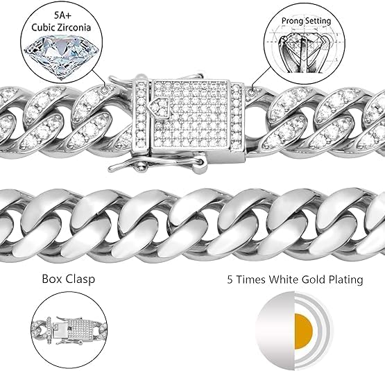 💎 طلاء ذهبي ثقيل 5 مرات - سلسلة الوصلات الكوبية المثلجة هي 5 أضعاف طلاء الذهب الأبيض عيار 14 قيراط، لذلك لن يبهت بسهولة ولن يجعل بشرتك أو ملابسك خضراء بالكامل، وسوف يلمع ويدوم لسنوات مع بريق ذهبي حقيقي إذا تم العناية به جيدًا.