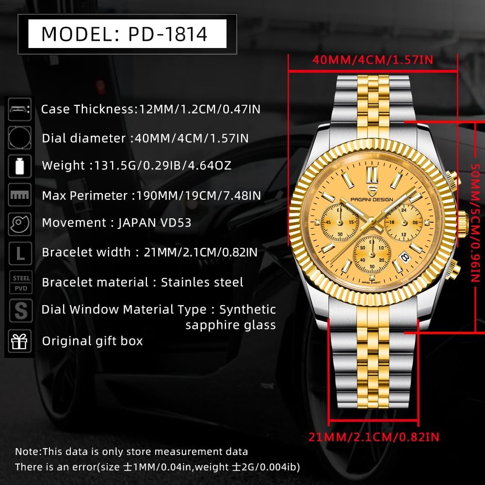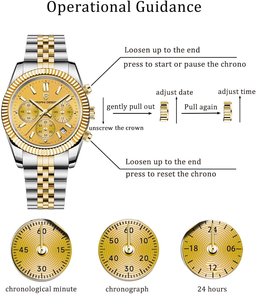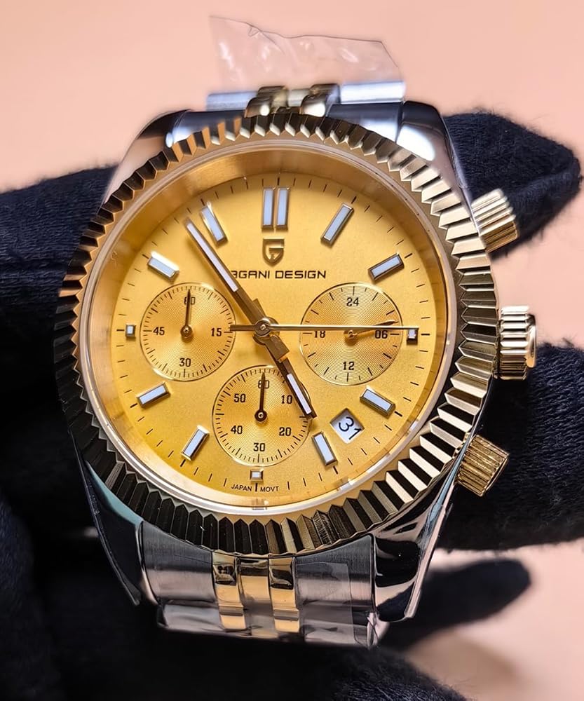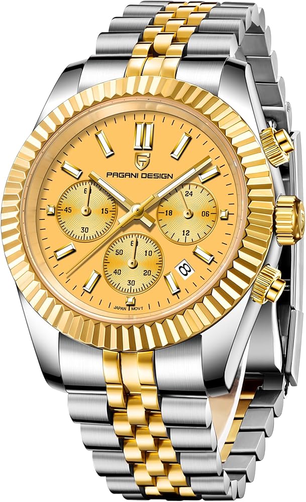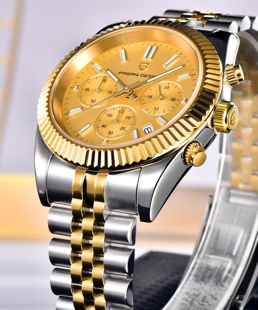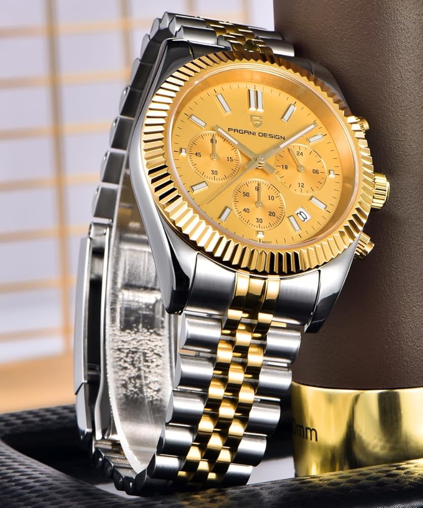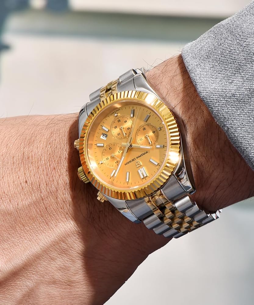 - تصميم فاخر: هيكل من الفولاذ المقاوم للصدأ بلونين يتميز بلمسة نهائية فضية وذهبية مع إطار مخدد وقرص كرونوغراف أسود لأسلوب متطور