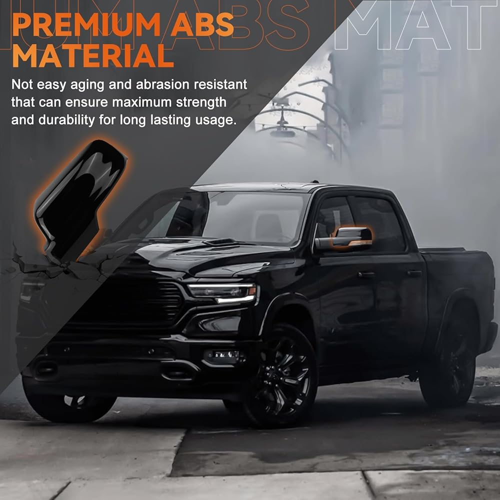 Upgrade your 2019-2025 Dodge Ram 1500 with our Glossy Black Side Mirror Covers Caps, designed for a direct replacement with Turn Signal Cut-Outs. Made from high-grade ABS material, these durable, scratch-resistant covers withstand impacts and harsh weather. Easy to install by clipping into place, they add a sleek, modern look while protecting your mirrors. Package includes 2 mirror covers. OEM Numbers: R: 6RP44KXJAA, L: 6RP45KXJAA. Verify your model before purchase.