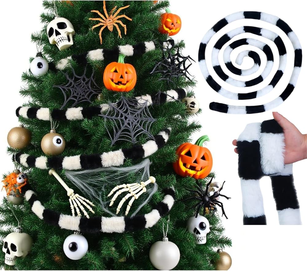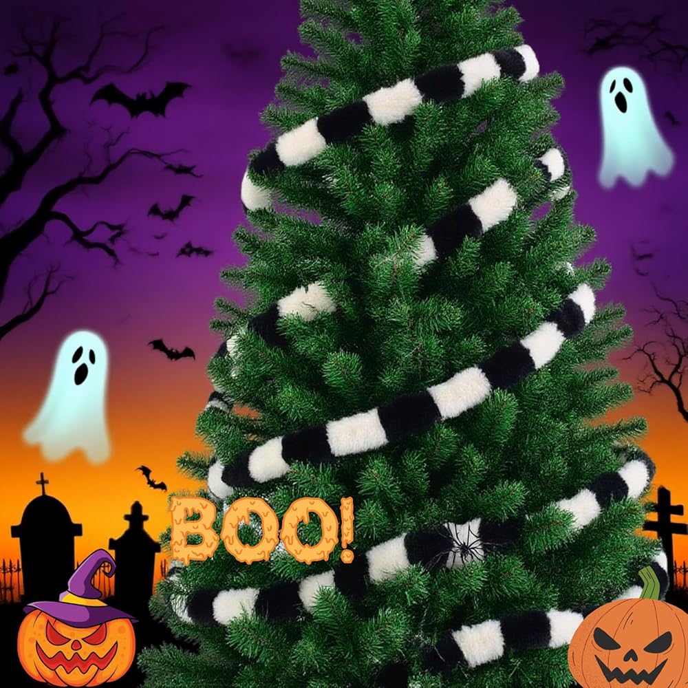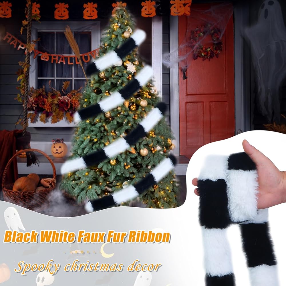 【زخارف سوداء لشجرة الكريسماس】شريط من الفرو الصناعي بتصميم فريد باللونين الأسود والأبيض، وطول كافٍ وتصميم رائع سوف يلبي احتياجاتك الأكثر ديكورًا لجزء الهالوين وعيد الميلاد.