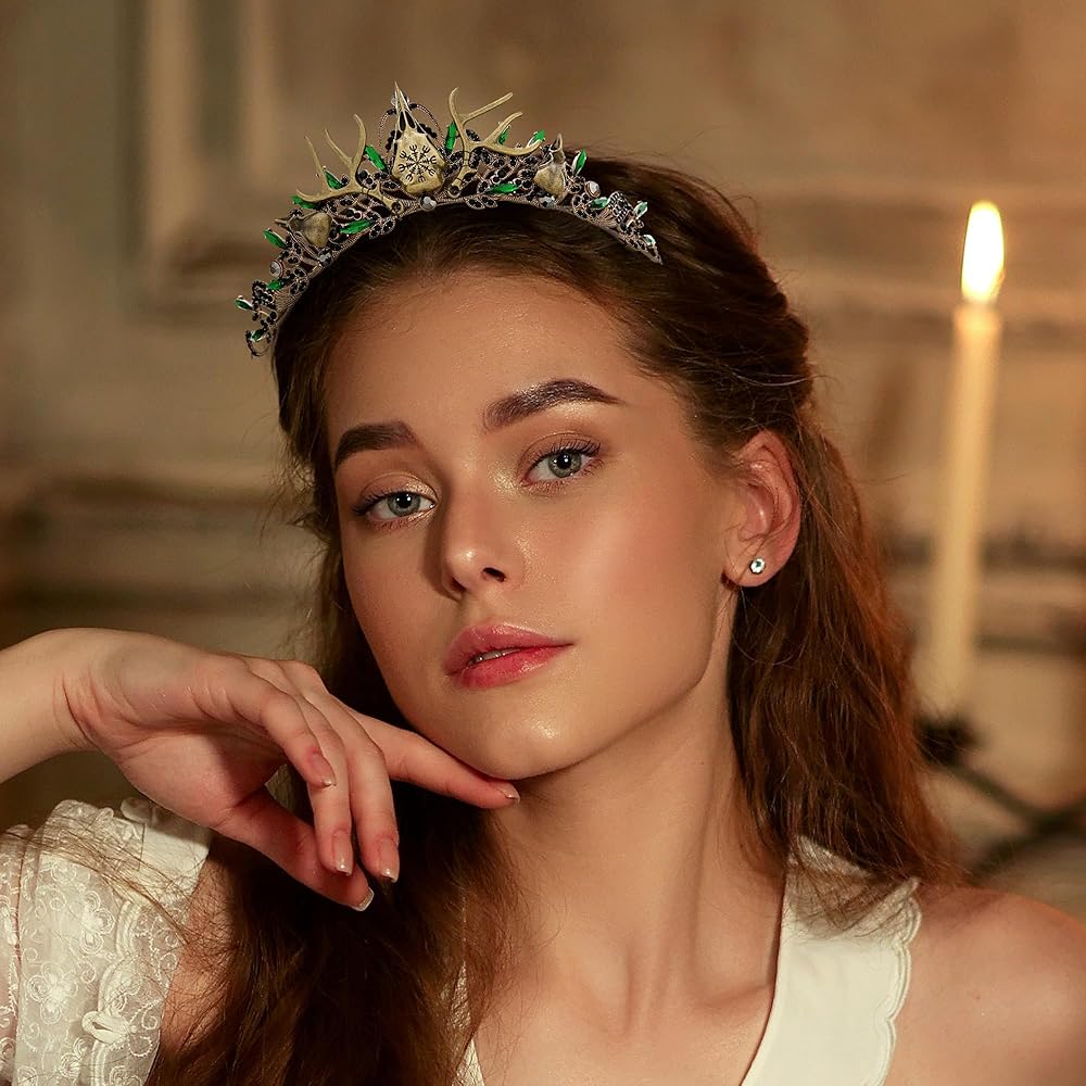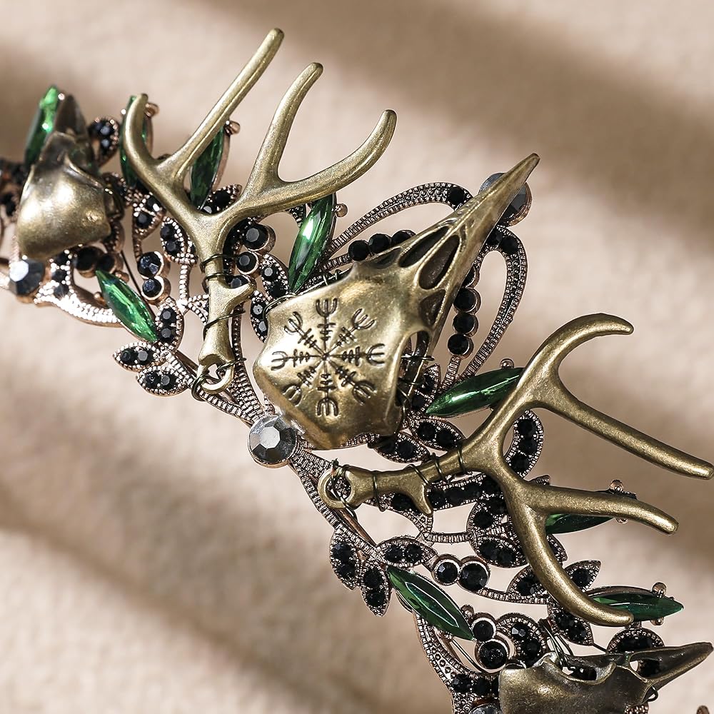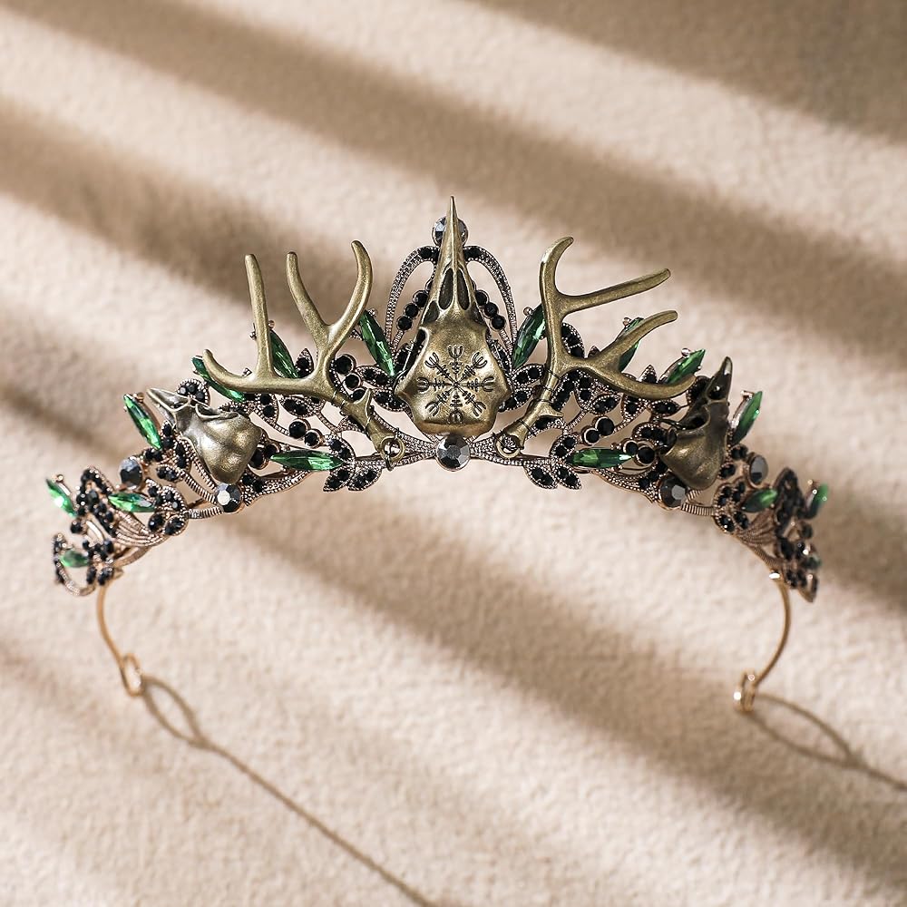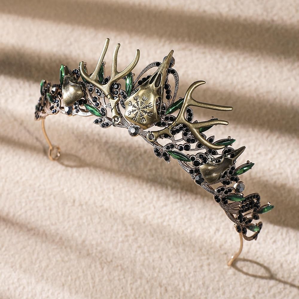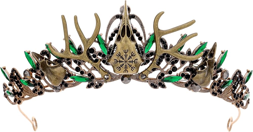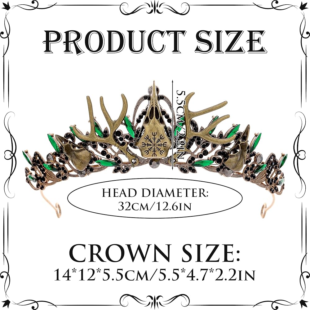 تصميم خيالي قوطي: يمزج هذا التاج بين الجمال القوطي والعناصر الخيالية، ويتميز بجمجمة غراب جريئة كنقطة محورية. مثالي لأولئك الذين يترددون في الأنماط الداكنة والأنيقة أو الذين يرغبون في التميز في الأحداث الخيالية