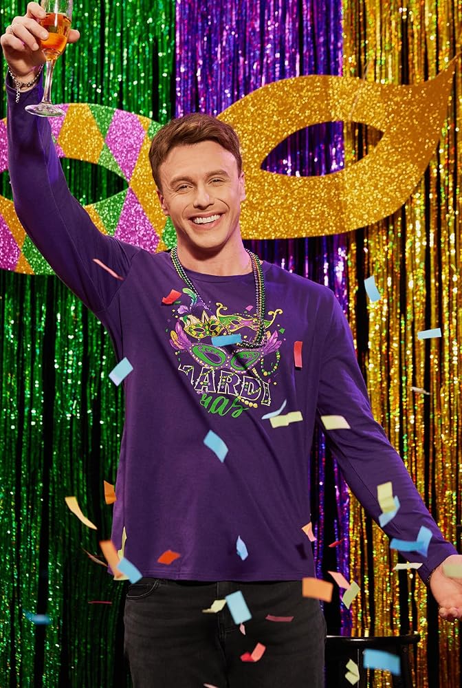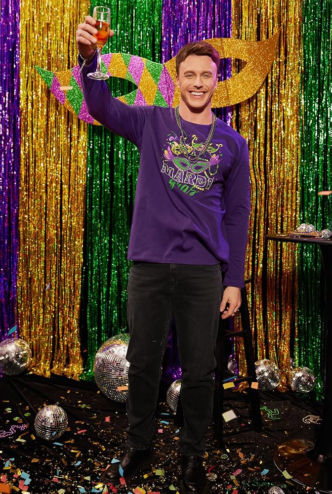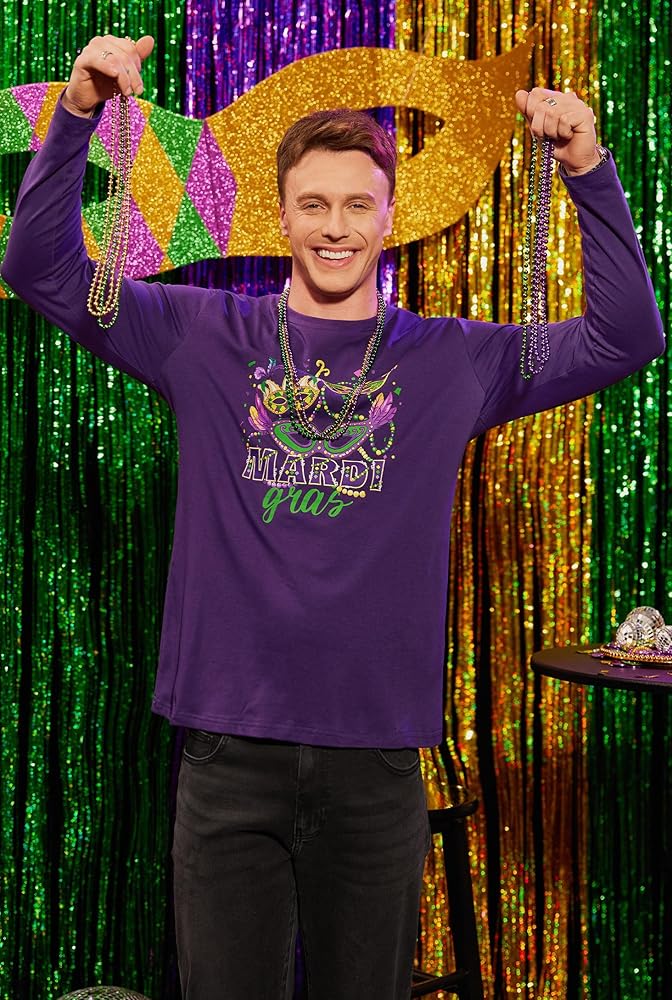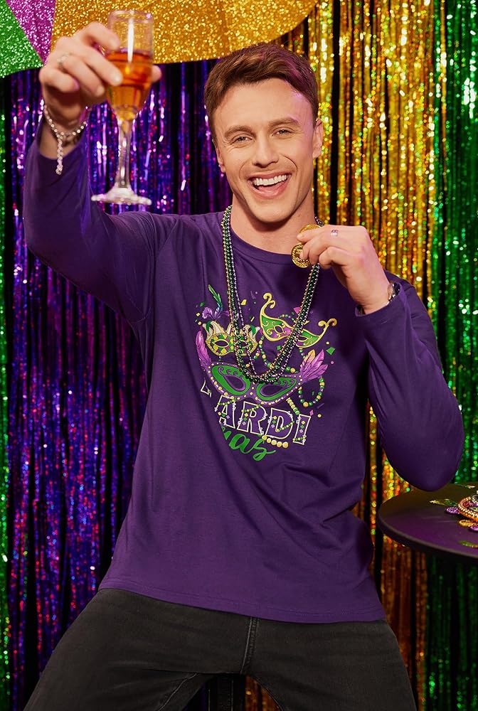 قميص MARDI GRAS: أين تذهب للحصول على أفضل وألمع ملابس Mardigras الرجالية؟ هنا! يتميز قميص الكرنفال طويل الأكمام بنمط فلور دي ليز مختلف أو تصميمات طباعة أخرى. دعونا نحاول خلق جو احتفالي. احصل على منتجك اليوم وارفع من أسلوبك!