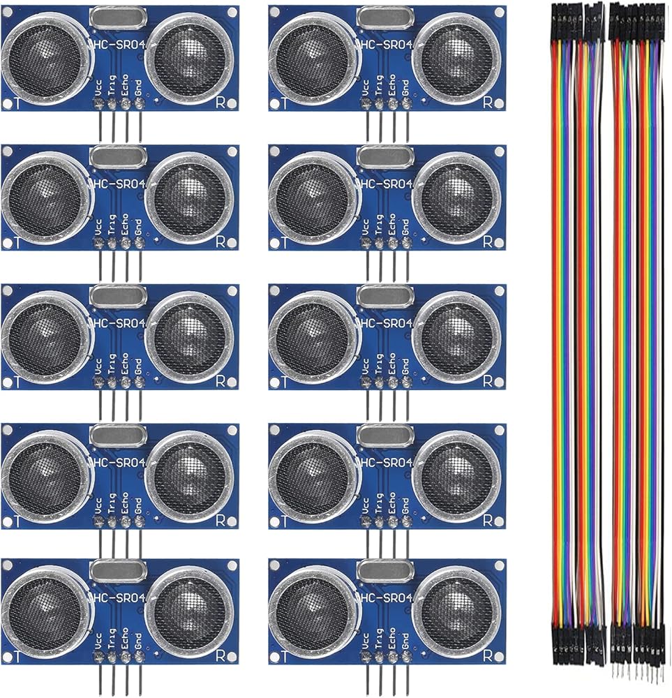 محتويات العبوة: سوف تحصل على 10 قطع من مستشعر المسافة بالموجات فوق الصوتية HC-SR04، و1 قطعة كابل 10 سنون 20 سم (M-F) و1 قطعة كابل 10 سنون 20 سم (F-F)