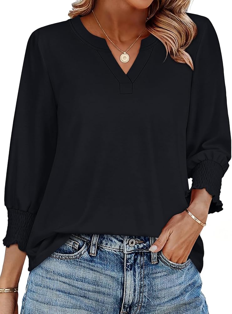 • التصميم: قمصان نسائية ذات أكمام مكشكشة تتميز برقبة على شكل حرف V مرتفعة، وأكمام منتفخة أنيقة، وحاشية منحنية تحدد الخصر من أجل مظهر مريح ومصقول