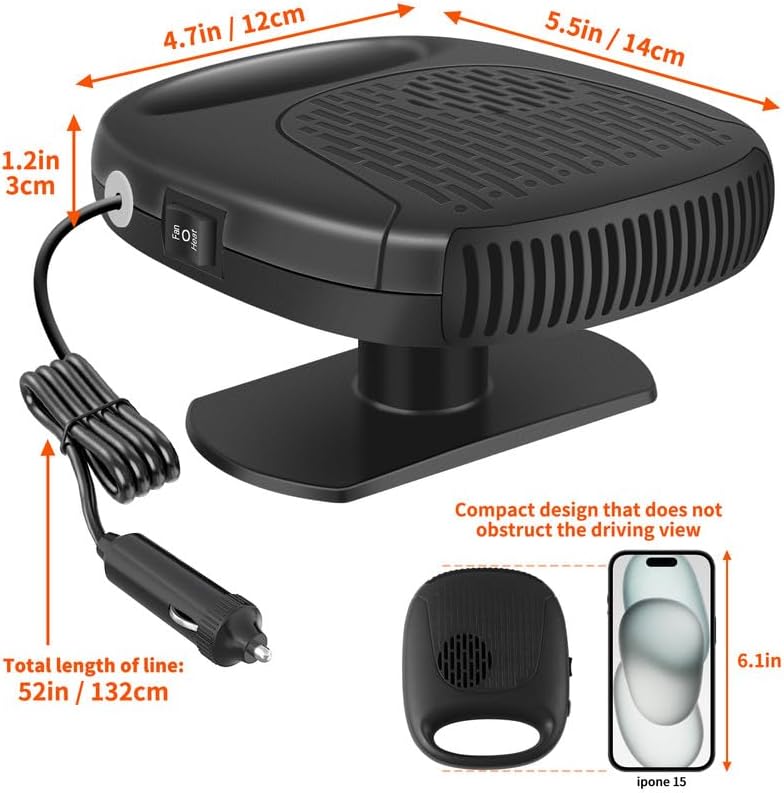 Portable car heater is upgraded in quality and a built-in fuse in the cigarette lighter plug, which automatically cuts off the power when there is a safety hazard, making it safer and more worry-free.