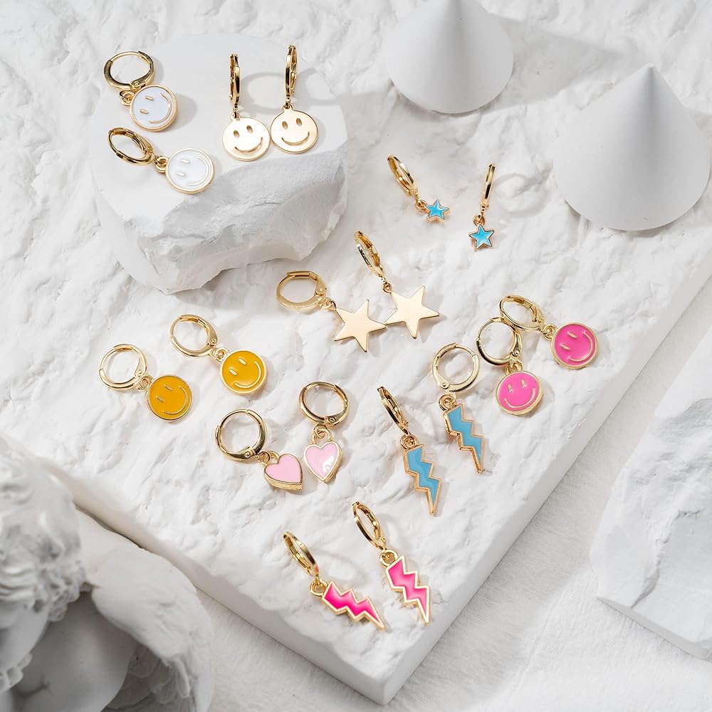 There are 9 pairs of preppy earrings with different patterns, including happy smile, lightning bolt, heart, and star. Unique design and variety of colors can meed your daily outfits needs and these ear accessories will help you create a chic looking.Make of durable alloy with oil dripping, not easy to fade, light weight and anti-allergic, which will not hurt your sensitive ears and can be applied for a long time.This pack would be a perfect gift for friends, classmates, sisters, families, lover, colleagues, teen girls on Valentines'day, Graduation, Prom, Birthday, Christmas, and other holidays. Share these cute preppy earrings with someone you love, they must be glad to receive such an adorable gift.Earrings Size: Length approx. 0.8 - 1.2 inches, width approx. 0.2 - 0.5 inches. They are small and cute, the earring clasp is easy to open, so that you can wear it easily.If your products have any quality or quantity issues of our product, please feel free to contact us and our sales support team will online to solve for you! Your happiness truly matters to us! Age grading: Over 3 years old
