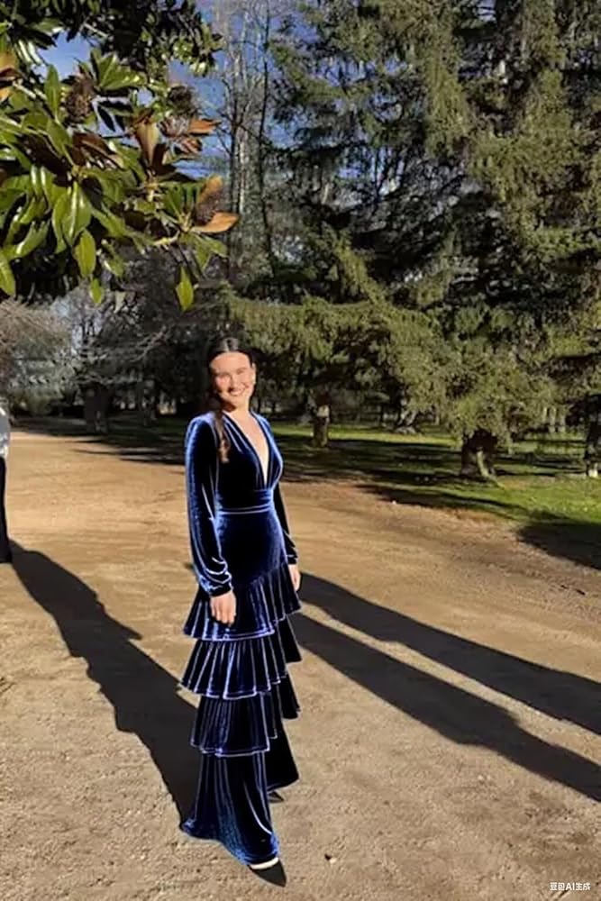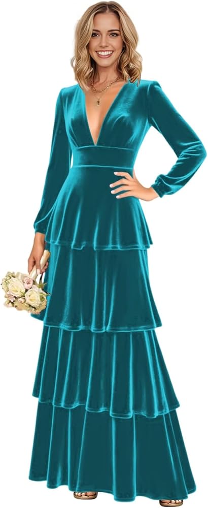 Features:Long Sleeve V Neck Velvet Bridesmaid Dresses Long, Tiered Formal Evening Ball Gowns Wedding Party Dreses for Women,Long Sleeves,Tiered, Pleated Ruched,A line,Zipper Back, Floor Length, Built-in Bra,Floor Length Velvet Evening Party Maxi Dresses for Wedding guest.