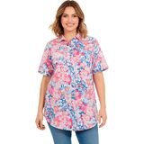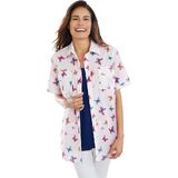 br>Stay cool and comfortable in this versatile short-sleeve cotton campshirt, perfect for layering or wearing on its own. br> Features a button-front design for effortless dressing and classic style. br> Two flap pockets add a touch of utility and a stylish accent. br> Rounded hem offers a flattering and relaxed fit for everyday wear. br> Crafted in lightweight woven cotton, this shirt ensures breathable comfort all day long. br> Available in a variety of beautiful prints and colors to suit every taste. br> 30" tunic length offers extra coverage and pairs perfectly with leggings or jeans. br> Easy care: simply machine wash for hassle-free maintenance. br> Woven cotton; imported