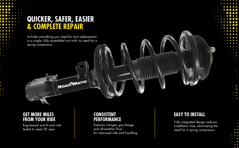Engineered to get more miles from your vehicle, the RoadMatic® strut assembly includes all required components in a single unit. It meets OE specifications and reduces installation time, eliminating the need for a spring compressor.