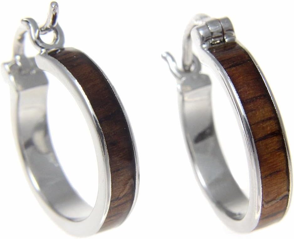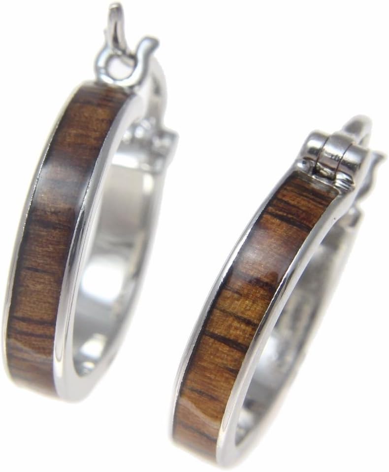 Koa Wood Hawaiian Rhodium Plated Brass 19mm Round Hoop Snap Closure Earrings