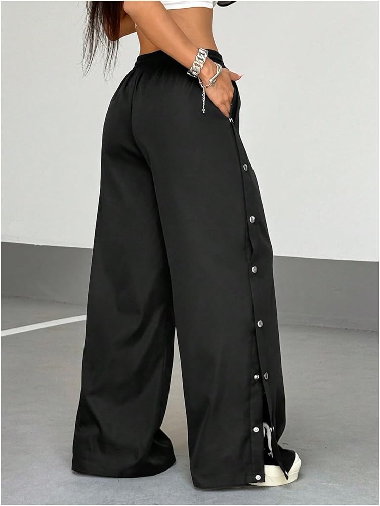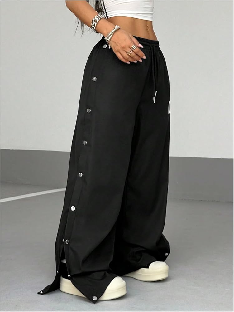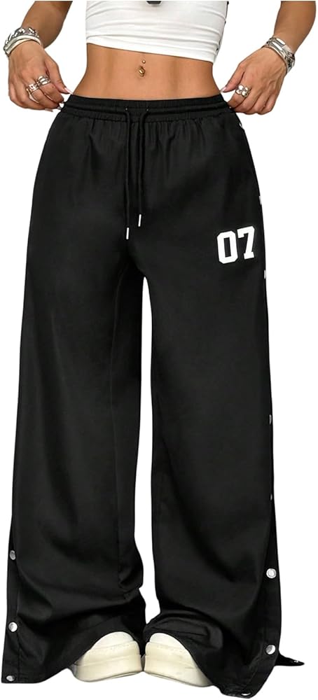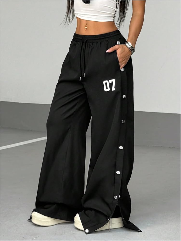 • Retro Pants, Hip Hop Pants, Streetwear for Women, Side Button, Number, Wide Leg, Elastic Waistband with Drawstring, Loose Fit