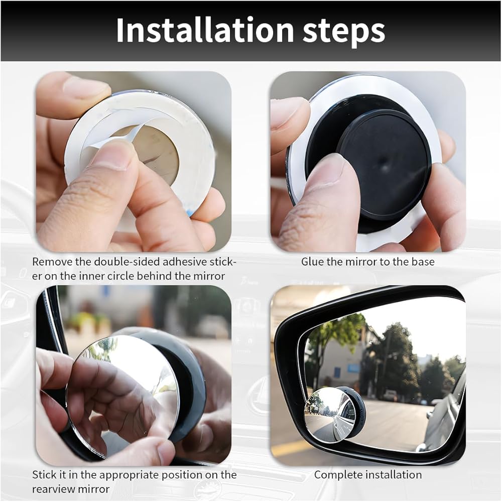 【Easy to Install】: This car blind spot mirror is easy to install. You just need to clean the original rearview mirror, tear off the back tape of this blind spot mirror, stick it to the base, tear off the adhesive backing on the base, and then stick it to the rearview mirror of your car.