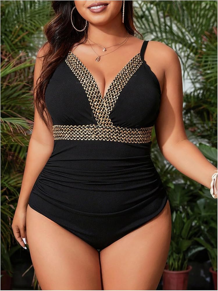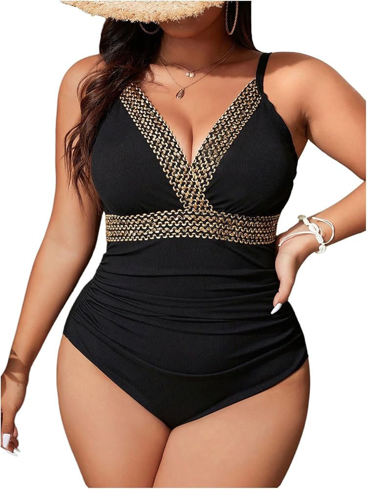 • Features: Plus size, rib knit, ruched, patchwork, v neck, one piece swimsuit for women