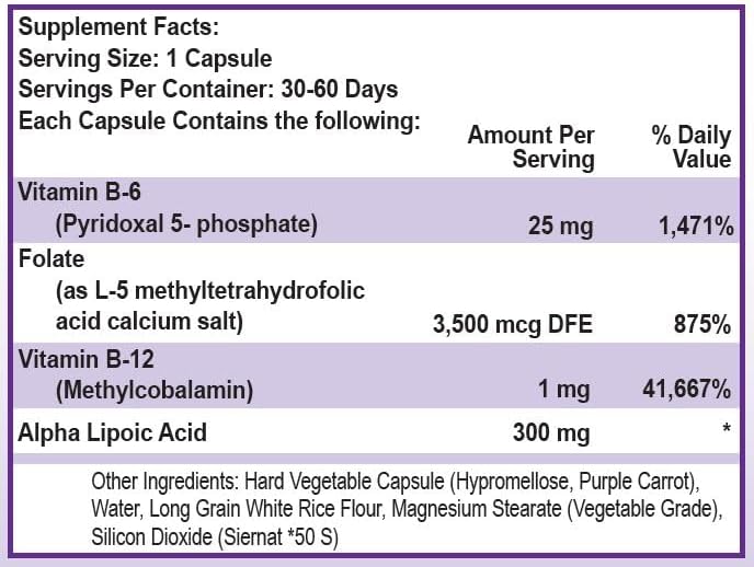 Nufola is an easy to swallow capsule manufactured and marketed by FDA inspected facilities and contains pharma-grade, active/absorbable form of L-methylfolate (3.75 mg), B12 (as preferred form methylcobalamin), pyridoxal-5-phosphate (B6 active/absorbable form, 25 mg), and alpha lipoic acid (ALA; 300 mg).