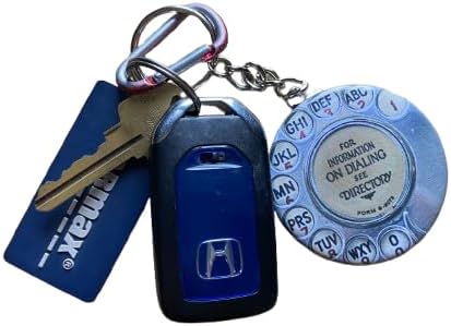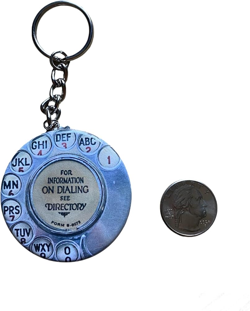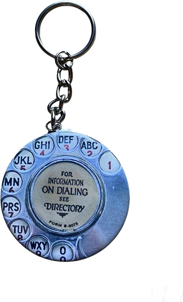 Step back in time with this retro style dial phone keychain, a bold retro statement piece inspired by the classic rotary telephone keychain. This retro keychain pays homage to an era outlined by conversations and connections. Meticulously crafted with a true replica of a rotary dial phone with an attached metal keyring, this mini rotary phone dial keychain adds instant old school charm and security to your everyday keys.