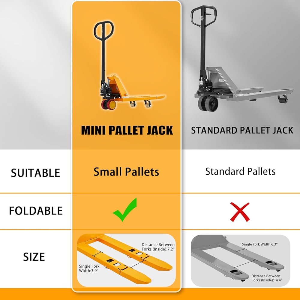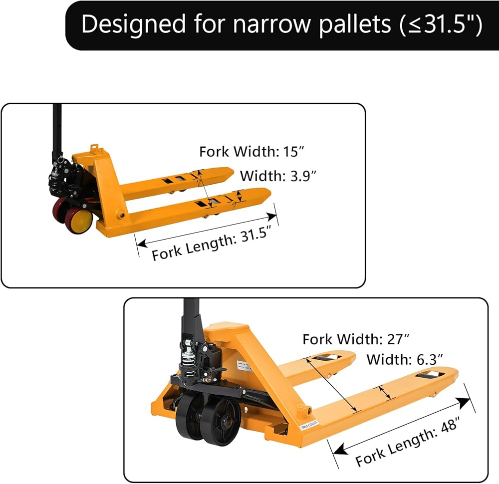 [يرجى ملاحظة]: نظرًا لحجم الشوكة، فإن شاحنة البليت هذه مخصصة للمنصات ذات أبعاد تساوي أو أقل من 31.5 بوصة. إذا كنت تستخدم منصة نقالة قياسية (48 بوصة × 40 بوصة) فقد لا يكون هذا المنتج مناسبًا لها.