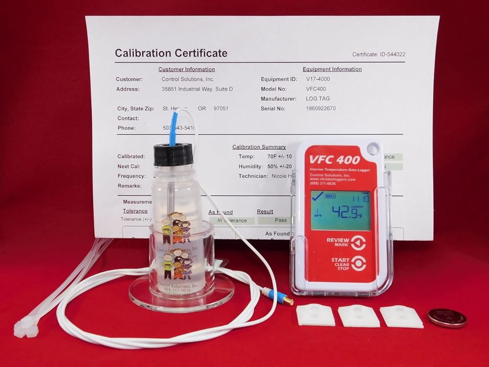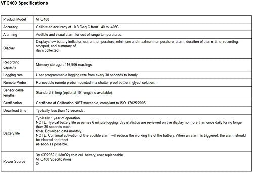 Built-in audible alarm. Alarm activation – Continuous 5 second alarm burst's with 3 different –Db tones New, easy to read LCD display with 30 day summary in calendar format. Auto-pause function - unplugging the external probe automatically suspends alarm & statistics processing. Record inspection marks at the push of a button. External Probe with high quality gold plated connector. It takes less than 10 seconds to download the data. The Control Solutions VFC400 Vaccine Temperature Monitoring Kit includes: VFC400 Data Logger (1) (Fridge/Freezer) NIST Traceable Certificate of Calibration, compliant to ISO/IEC 17025:2005 (1) 3” Stainless , 1/8”OD Probe, with 5' senor cable P/N SSP-0615 (1) High Density plastic (shatter proof) glycol buffer bottle P/N SPB1019 (1) Acrylic stand P/N AS1031 (1) Installation/Mounting Kit (includes wall mounting bracket) P/N IMK1015 (1) Extra replaceable battery FREE installation instructions and Webinar training 2 Year warranty The VFC400 Vaccine Monitoring Kit measures and stores up to 16,905 temperature readings from an External Probe. The display is designed to show ‘at a glance' if temperature excursions have occurred during the current day and up to the previous 29 days. The display also shows the current temperature reading, the current time, recording status and battery status. The alarm is triggered if temperature readings are outside pre-set alarm limits. The status indicator changes from a check mark to an X and the audible alarm will sound. From the display you can review the minimum and maximum temperatures for each day the VFC400 has been logging up to 30 days. The VFC400 resets the min/max temperature at midnight every night and puts an inspection mark on the chart indicating the min/max has been checked.