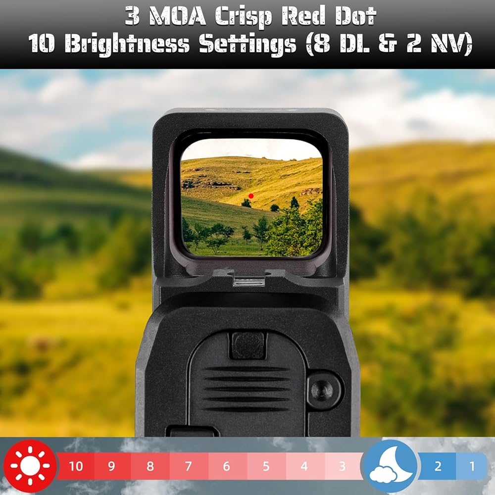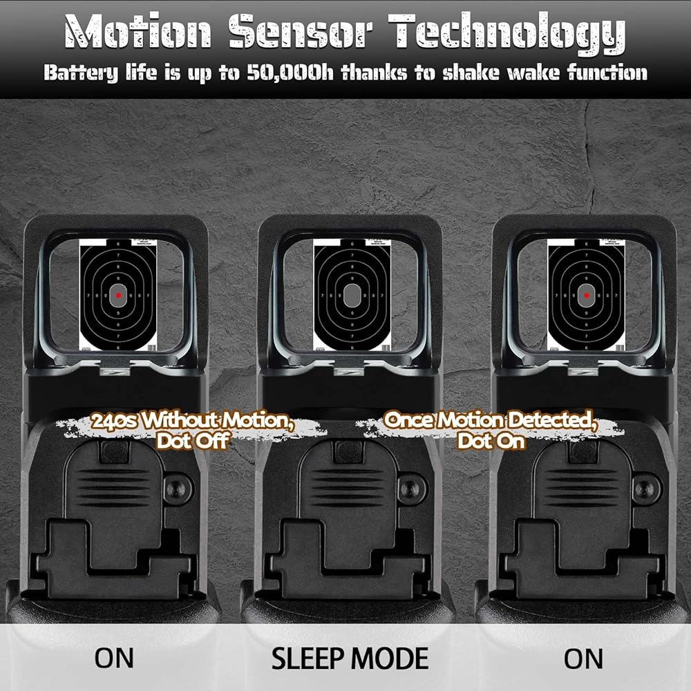 𝗠𝗼𝘁𝗶𝗼𝗻 𝗦𝗲𝗻𝘀𝗼𝗿: سيتم إيقاف مشهد النقطة الحمراء تلقائيًا بعد 4 دقائق من عدم النشاط، وسوف يستيقظ في لحظة حتى مع أخف حركة. يصل عمر البطارية إلى 50,000 ساعة بفضل وظيفة الاهتزاز.
