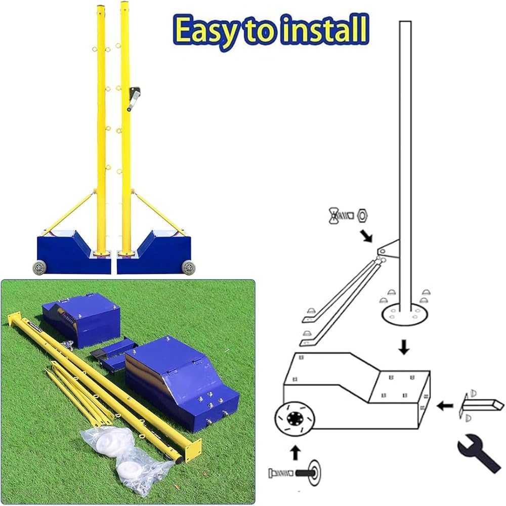 إعداد خالٍ من المتاعب: تم تصميم عمود الكرة الطائرة لتوفير الراحة، ويأتي مزودًا بعجلات لسهولة الحركة ولا يسبب ضررًا للأرضيات الداخلية. التثبيت سريع ومباشر، مع الأدوات والمسامير المضمنة للإعداد السريع.