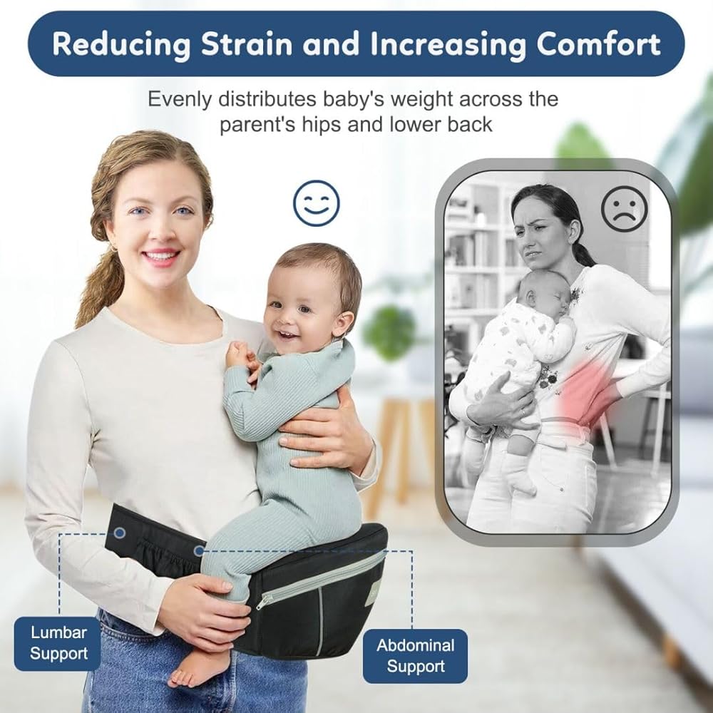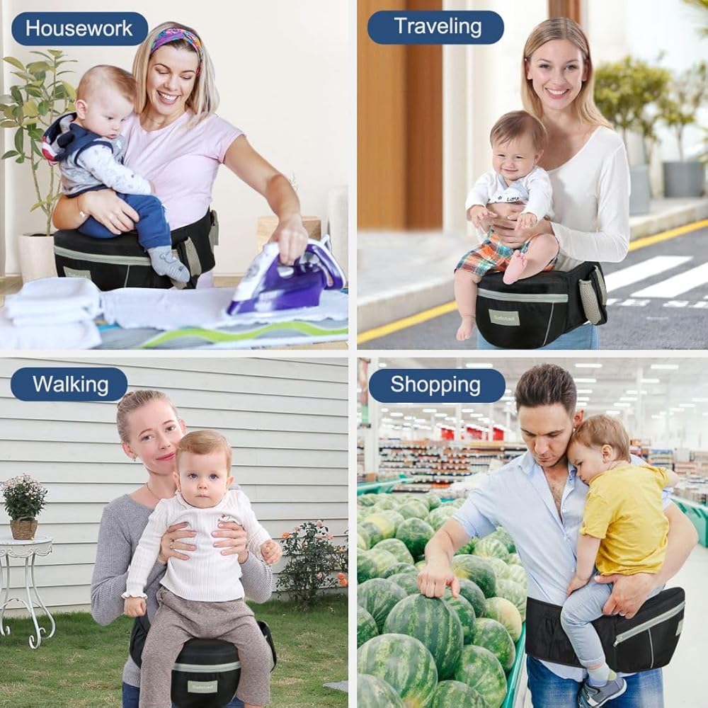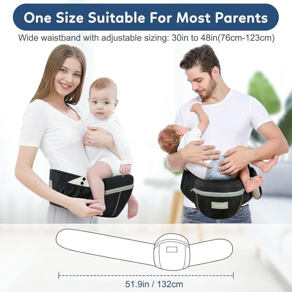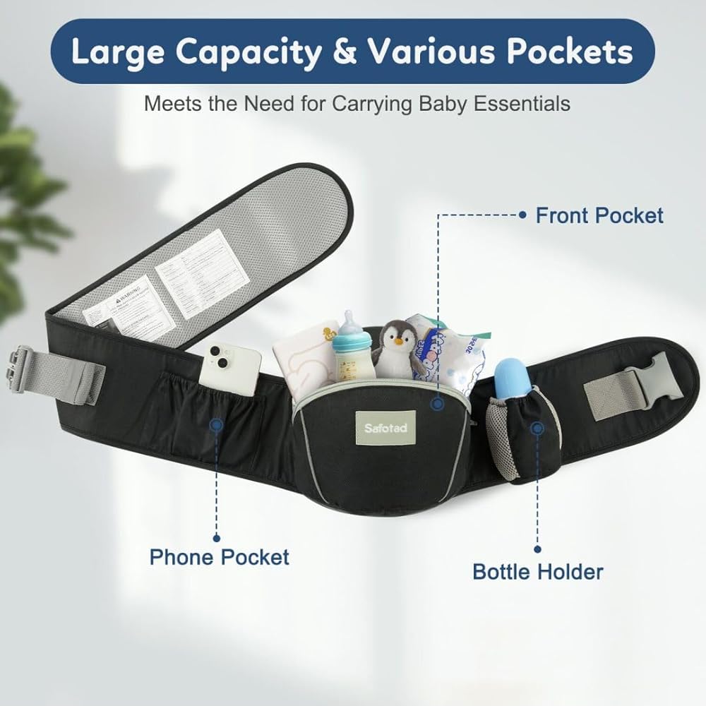 جيب تخزين مريح: يتميز مقعد الورك لحامل الأطفال خفيف الوزن بجيب تخزين كبير، مثالي لحمل الأساسيات مثل الحفاضات والمناديل المبللة، مما يلغي الحاجة إلى حقيبة إضافية. بالإضافة إلى ذلك، تحتوي جوانب حزام الخصر على جيوب مصممة لحمل الزجاجات واللهايات والهواتف الذكية وغيرها من الأشياء الصغيرة، مما يجعل الخروج أسهل وأقل عبئًا على الآباء.