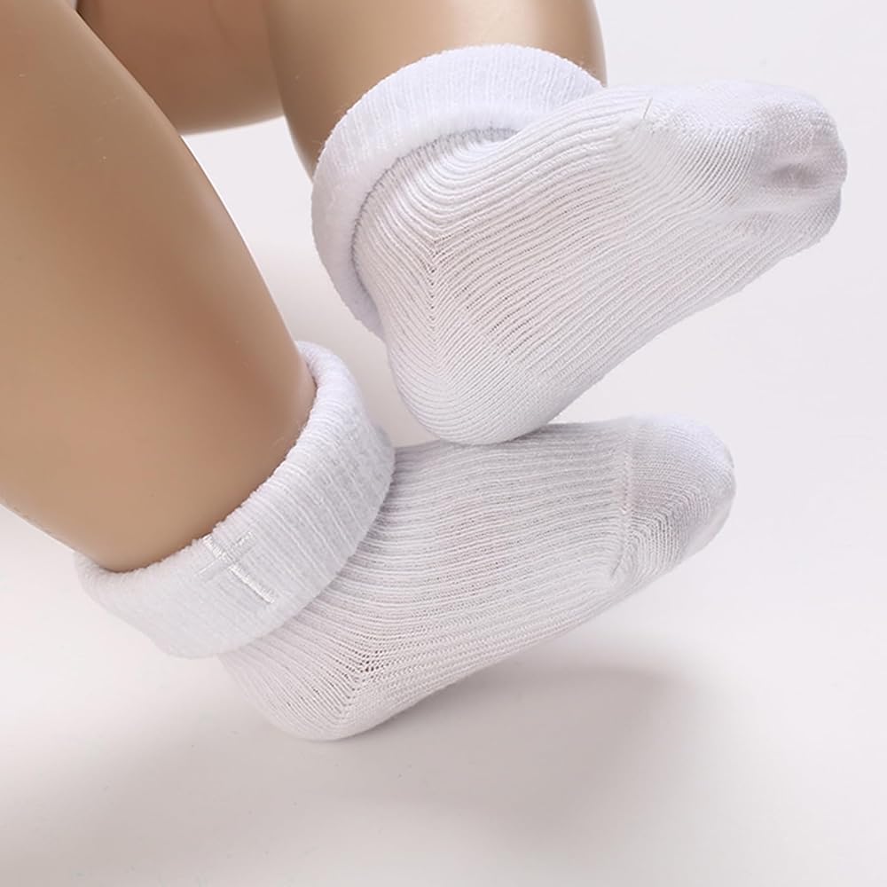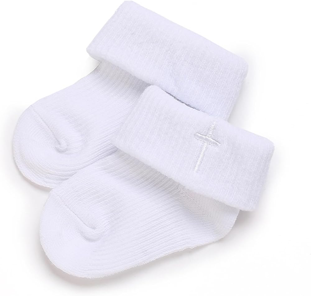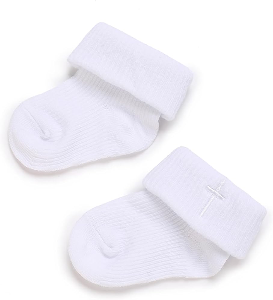 Make your baby's special day even more memorable with these classic white baptism socks. Designed for newborns and infants, these ankle crew socks feature a soft turn-cuff with an embroidered cross for a meaningful, timeless touch. Crafted from a breathable cotton blend, they are gentle on delicate skin while keeping little feet cozy and comfortable. The stretchy ribbed cuff ensures a secure fit that stays in place without pinching, perfect for active little ones. Ideal for christenings, baptisms, baby dedications, or first communions, these socks pair beautifully with gowns, suits, or formal outfits. They also make a thoughtful keepsake or gift for baby showers and godparents, helping you cherish this important milestone for years to come.