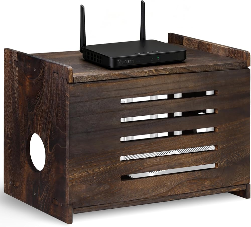 Charcoal Grilled Wood Material: Made from naturaI wood, the retro style router box will not block wifi signals with an attractive wood grain, blending seamlessly with home decor style. Wireless router shelf is both Ec0-friendly and aesthetically pleasing.