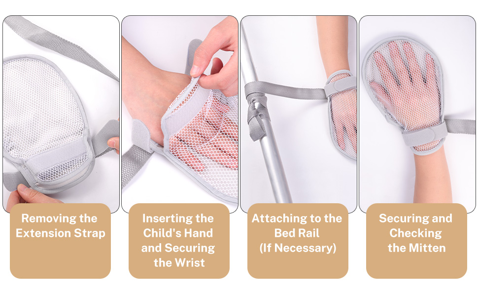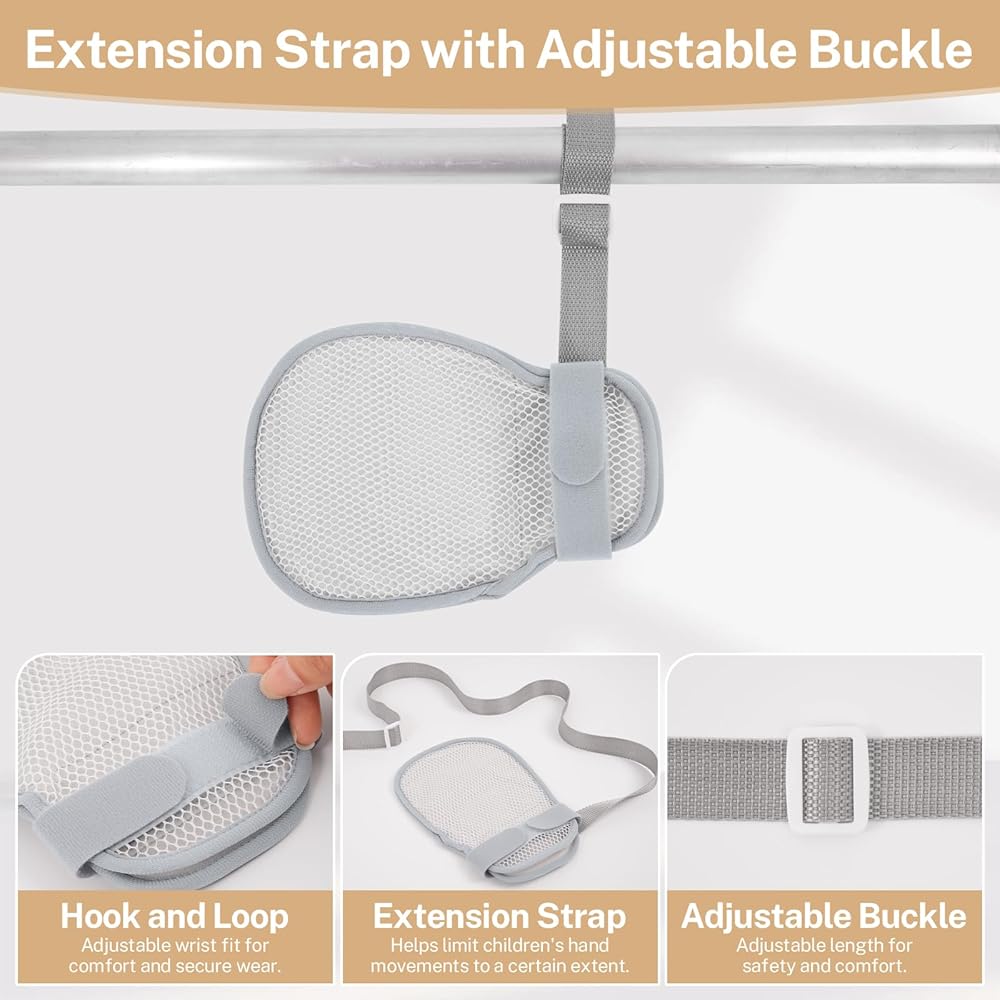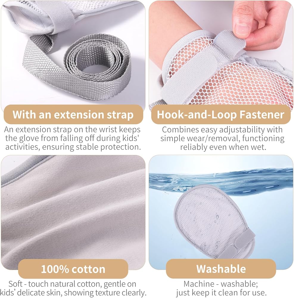 مزودة بإغلاق ناعم بخطاف وحلقة: توفر هذه القفازات وظيفة سهلة الارتداء والخلع للآباء المشغولين. يمنع التثبيت الآمن الإزالة العرضية، ويدعم تطبيقات حماية مص الإبهام لمساعدة الأولاد والبنات الصغار على كسر عادات مص الأصابع بأمان وراحة.