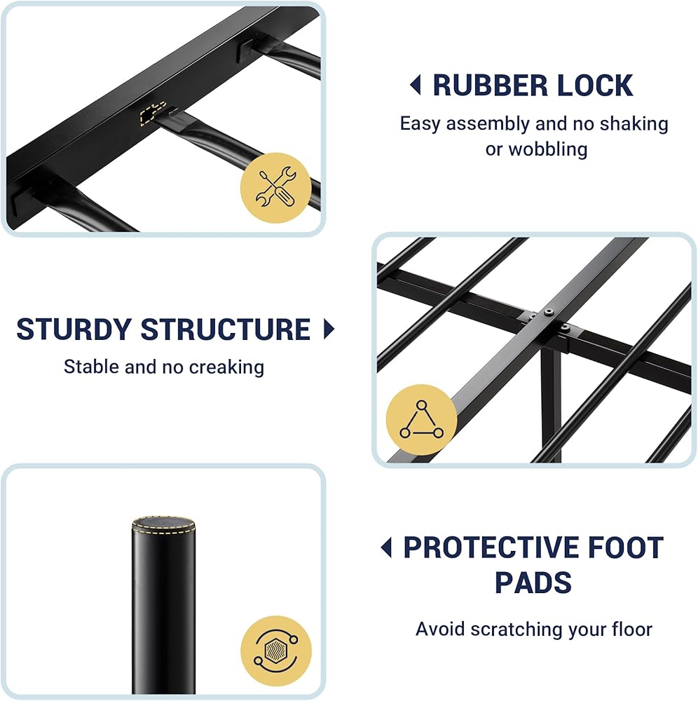 هيكل مانع للصرير: تم تصميم إطار السرير للاستخدام الخالي من الضوضاء، ويتميز بوصلات آمنة وتصميم مضاد للضوضاء لضمان نوم هادئ ليلاً. ستحمي الوسادات البلاستيكية الموجودة على أقدام السرير أرضيتك من الخدوش