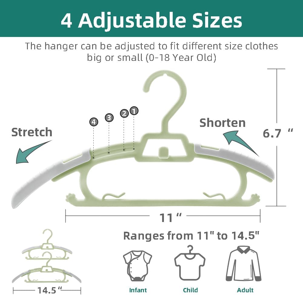 بدلة أطفال متعددة الأعمار: طول قابل للتعديل من 27.94 إلى 35.56 سم، هذه الشماعات القابلة للتمدد/التقصير سترافق الطفل/الطفل منذ الولادة وحتى البلوغ. صغير أو كبير بما يكفي للمعاطف والفساتين والتنانير والقمصان والسترات والملابس الداخلية والملابس الداخلية والملابس الداخلية والبطانية القابلة للارتداء وغيرها