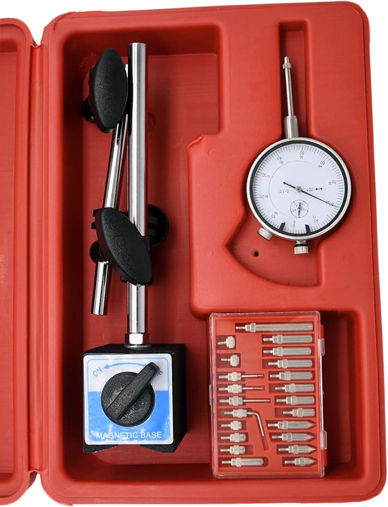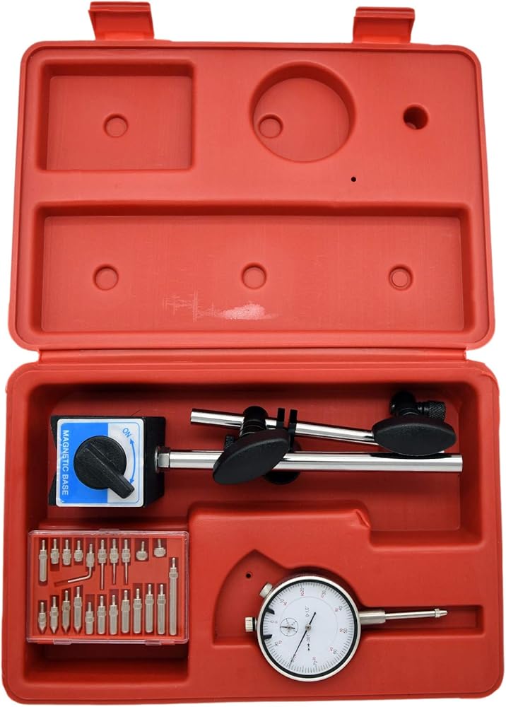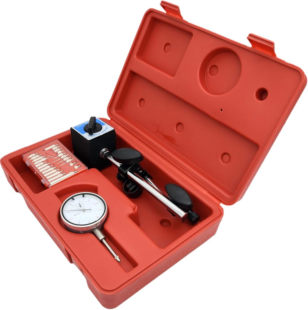 • مجموعة أدوات مؤشر اختبار المينا: 0-1 انش، مؤشر المينا: التخرج 0 انش، قطر الجذع 3/8 انش، وجه مينا 2 انش وعروة الظهر. القاعدة المغناطيسية: الارتفاع الكلي 9 انش، مفتاح تشغيل وإيقاف 130 باوند. سحب قوي، مقاس القاعدة 2 انش عرض × 2-1/2 انش عمق.