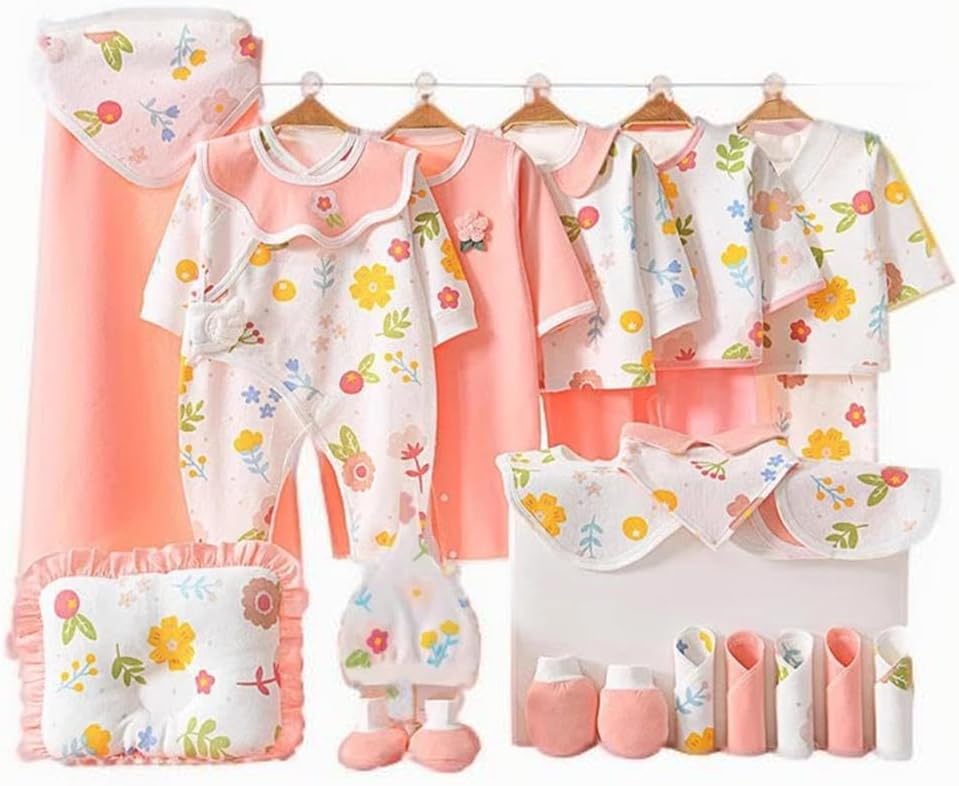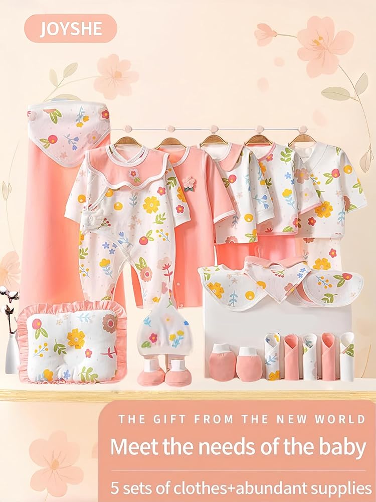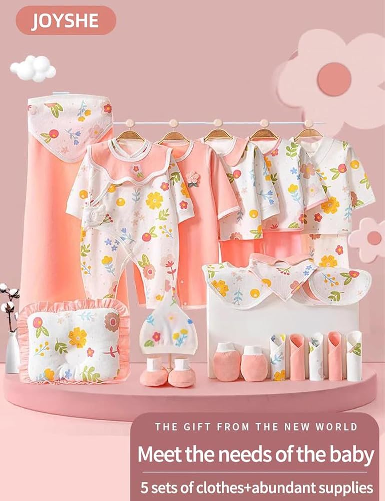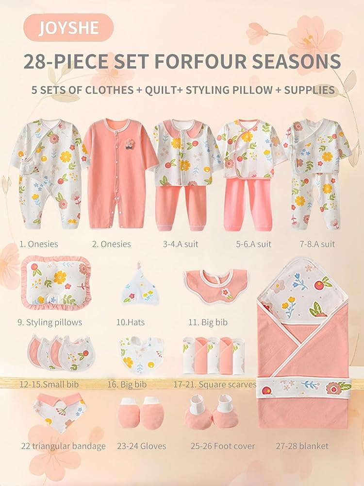 Welcome your little one with this comprehensive 28-piece baby clothing and essentials set from JOYSHE. Perfect for all four seasons, this adorable collection features 5 complete clothing sets in gentle pink and white with charming floral prints. The set includes 2 onesies, 3-piece outfits, and various daily necessities. Each piece is crafted from soft cotton blend material with convenient snap button closures for easy dressing. The collection comes with practical accessories including a , a cozy blanket, matching hats, gloves, and foot covers. The delicate floral pattern in cheerful yellow, pink, and blue creates a sweet, harmonious look across all pieces. This regular-fit set is designed for newborns and makes an ideal baby shower gift. The entire collection is machine washable for convenient care. Each piece is thoughtfully designed to ensure your baby's comfort while looking adorably coordinated. The package dimensions are 28 x 18 x 8 cm, making it perfect for gifting or storage.