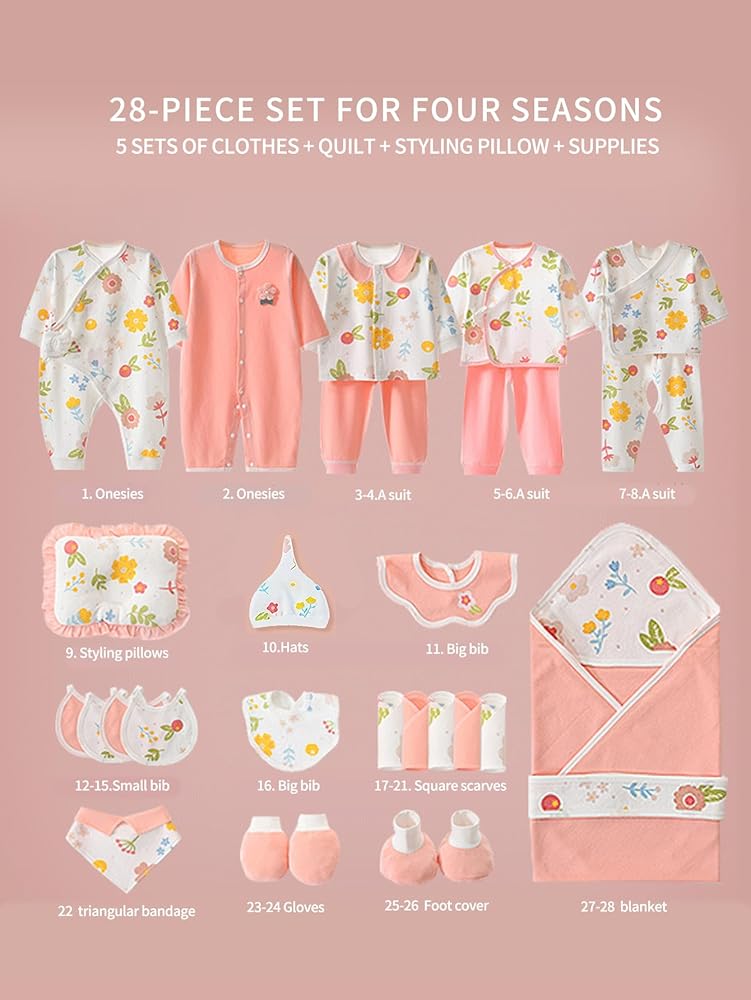 COMPLETE SET: 28-piece baby essentials including 5 sets of clothes, blanket, , hats, and hand/foot covers for year-round comfort