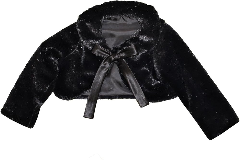 Have your little girl looking regal with this faux fur bolero jacket; Long Sleeve Faux Fur Bolero Jacket with Ribbon Tie Boe; Above the Waist Length and Fully Lined; Faux Fur Collar for Added Style; 100% Polyester; Hand Washable; Made In The USA