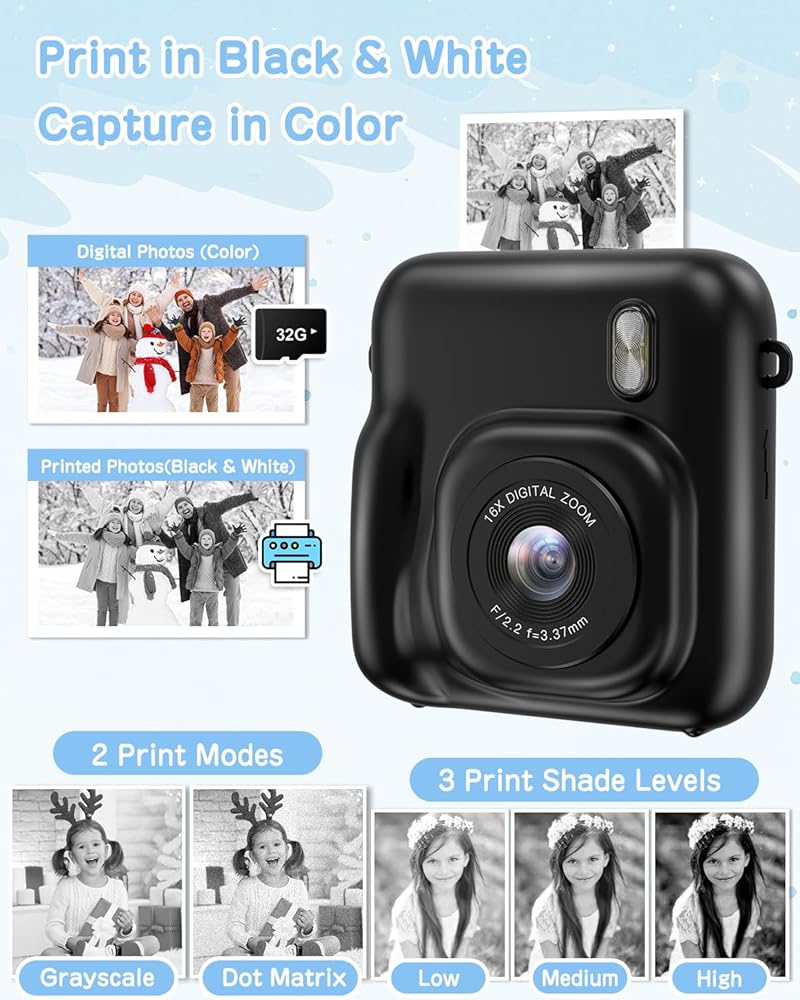 • طباعة، صور بدقة 48 ميجابكسل، فيديو بدقة 1080 بكسل - الكل في واحد! - كاميرا الطباعة الفورية للأطفال هي كاميرا رقمية 3 في 1 تجمع بين الطباعة الفورية وتسجيل الفيديو والتصوير الفوتوغرافي. بمجرد الضغط على الغالق، يمكن للأطفال الحصول على مطبوعات بالأبيض والأسود على الفور، مما يسمح لهم بالتقاط الذكريات وطباعتها على الفور. وفي الوقت نفسه، يتم حفظ الصور الملونة النابضة بالحياة على بطاقة ذاكرة كاميرا الأطفال. تتيح ميزة تسجيل الفيديو بدقة 1080 بكسل للأطفال إنشاء مقاطع فيديو ممتعة. تعد كاميرا الأطفال هذه أكثر من مجرد كاميرا لعبة، فهي رفيق إبداعي لمغامرات طفلك الصغير