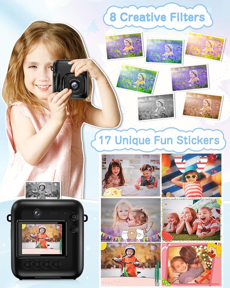 • المرح والأمان - تم تصميم الكاميرا الفورية للأطفال مع وضع المتعة والأمان في الاعتبار، وتضم أكثر من 25 فلترًا وإطارات ملصقات. يمكن للأطفال إطلاق العنان لذوقهم الفني من خلال تلوين وتزيين صورهم المطبوعة، وتحويل الذكريات إلى روائع شخصية. تتميز هذه الكاميرا الفورية، المصنوعة من مواد آمنة وصديقة للأطفال، بأنها متينة وأنيقة، مما يمنح الآباء راحة البال بينما يستكشف أطفالهم جانبهم الإبداعي