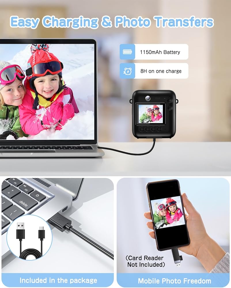 • سهولة الاستخدام وعمر بطارية طويل - تم تصميم الكاميرا الفورية الخاصة بنا للأطفال الصغار لسهولة الاستخدام، وتجمع بين البساطة والأداء الوظيفي. يسمح تخطيط الزر البديهي للمصورين الشباب بالبدء بسرعة. يتم الشحن بسهولة، وتوفر الشحنة الواحدة ما يصل إلى 8 ساعات من المرح المتواصل، مما يجعلها مثالية للنزهات ووقت اللعب. نقوم أيضًا بتضمين بطاقة SD صغيرة بسعة 32 جيجابايت، قادرة على استيعاب أكثر من 2500 صورة إلكترونية ملونة. عندما يحين وقت مشاركة الذكريات، فإن كابل Type-C المتضمن يجعل من السهل توصيل الكاميرا الفورية بالكمبيوتر لتنزيل الصور بسرعة